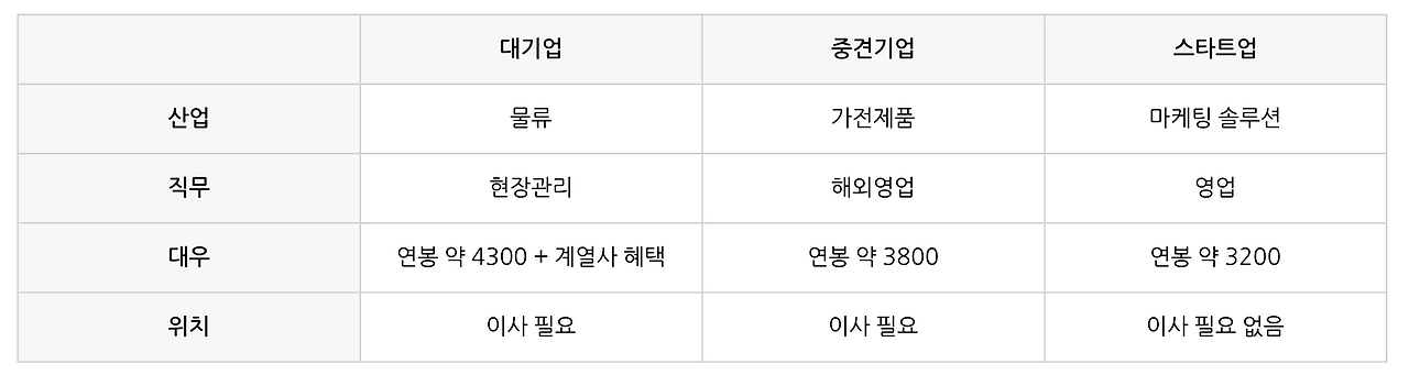 최종 합격한 곳은 인지도가 꽤 있는 중견기업의 해외영업이었고, 나머지 2곳은 각각 대기업 1곳, 스타트업 1곳이었다.
