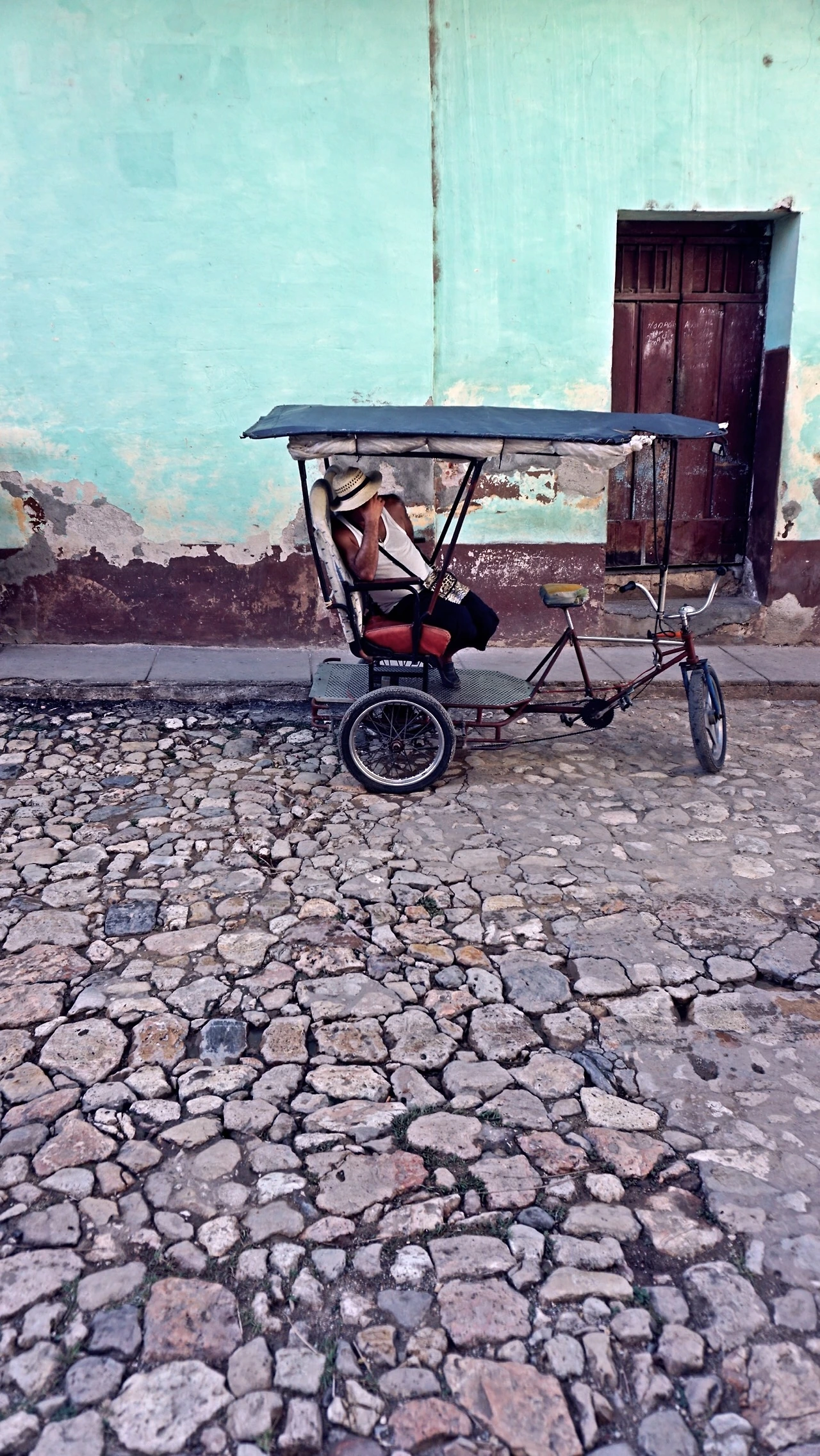 트리니다드 관광객들의 주요 이동 수단인 삼발이 자전거꾼이 피곤한듯 자전거 위에서 쉬고 있는 모습을 카메라에 담았다. 족히 수십년은 되어보이는 낡은 자전거가 그의 지난 삶과 현재를 그대로 보여주는 듯 했다.