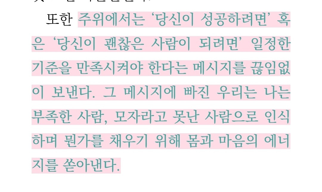 있는 그대로 괜찮지 않다는 자기인식이 세상과 타인에 의해 자동적으로 강화된다는 이야기 입니다. 그리고 그렇게 타인과 세상이 세워놓은 기준을 만족시키기 위해 타인의 욕망을 욕망하며 자신을 학대하게 되는 것입니다.