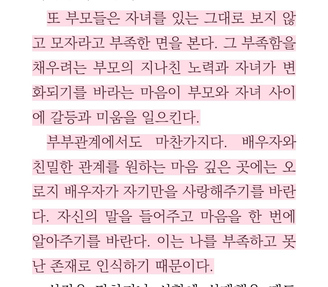 가장 가까운 관계인 부모와 연인역시 그렇게 한 개인이 있는 그대로 괜찮을 수 없도록 영향을 끼치게 됩니다.