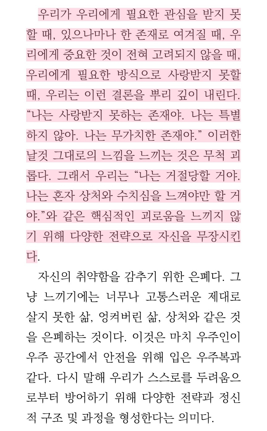 이렇듯 인간은 그냥 이 세상에 살아 숨쉬는 것 만으로도 나는 부족해, 뭔가 결함이 있는거야라는 체험을 하며 살아갈 수 밖에 없습니다. 그렇기 때문에 그러한 체험을 통해 무의식 수준에 결핍감,불완전함,두려움,불안함등이 형성되는 것이죠. 타인뿐만아니라 자기자신도 그러한 타인과 세상의 태도를 자신의 것들로 받아들여 자신을 그렇게 가혹하게 대합니다.