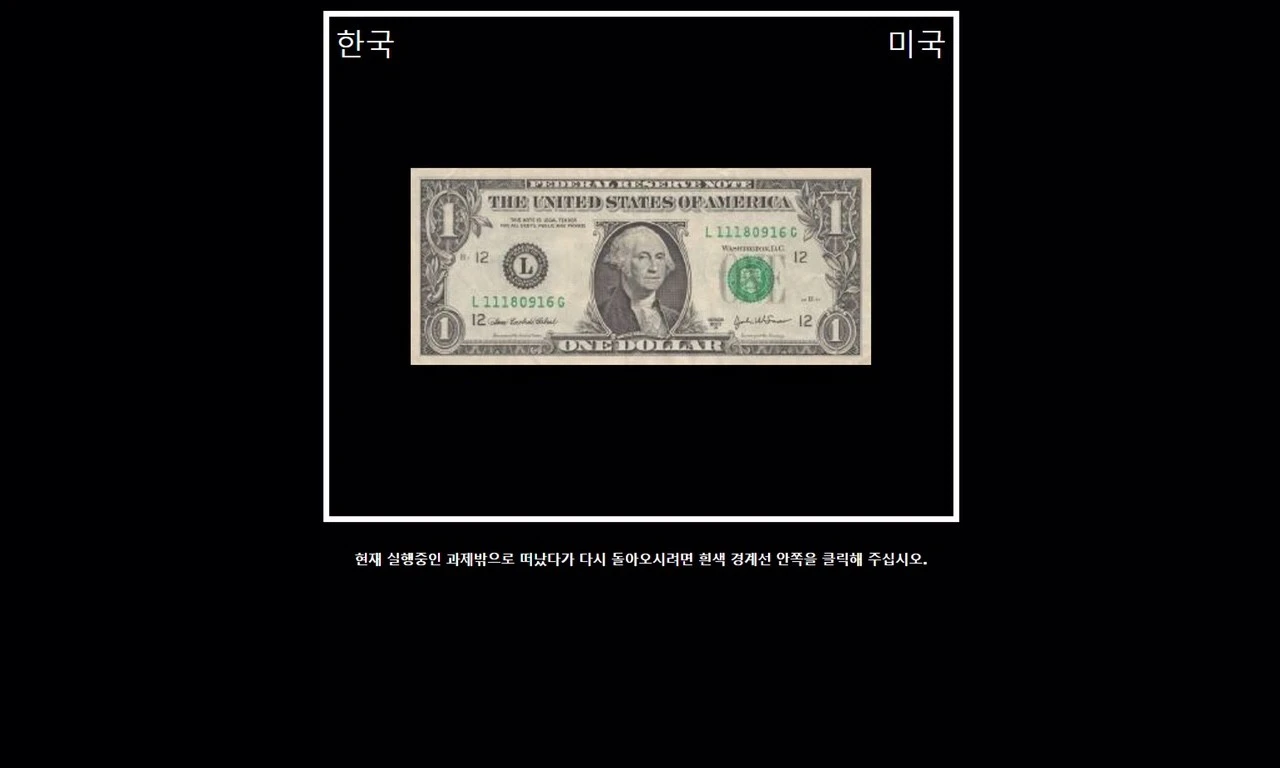 예를 들어, 아래와 같이 화면의 가운데에 미국 화폐 사진이 등장하면 ‘ㅑ’를 눌러 오른쪽으로 분류하면 된다. 반대로, ‘세종대왕’과 같이 한국과 관련있는 단어가 등장하면 ‘ㄷ’을 눌러 왼쪽으로 분류하는 것이다. 이 경우, 만약 ‘ㄷ’이 아닌 ‘ㅑ’를 눌러 ‘세종대왕’을 ‘미국’으로 잘못 분류하면, 빨간 X 표시가 화면에 나타난다. 이렇게 잘못 분류해서 X 표시가 나타난다면, 다시 ‘ㄷ’을 눌러 올바르게 분류해주자.