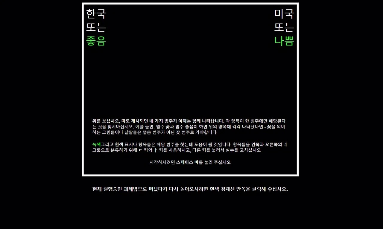 이상과 같은 분류 작업을 모두 완료하면, ‘한국’, ‘미국’이 있었던 자리에 ‘좋음’, ‘나쁨’과 관련된 자극들을 분류하는 작업을 수행하게 된다. 방법은 앞선 작업과 똑같고, 다만 분류하게 되는 자극의 범주가 ‘좋음’, ‘나쁨’으로 달라질 뿐입니다. 예를 들어, ‘평화’라는 긍정적 의미의 단어가 제시되면 ‘좋음’으로, ‘실패’라는 부정적 의미의 단어가 제시되면 ‘나쁨’으로 키를 눌러 분류하면 된다.