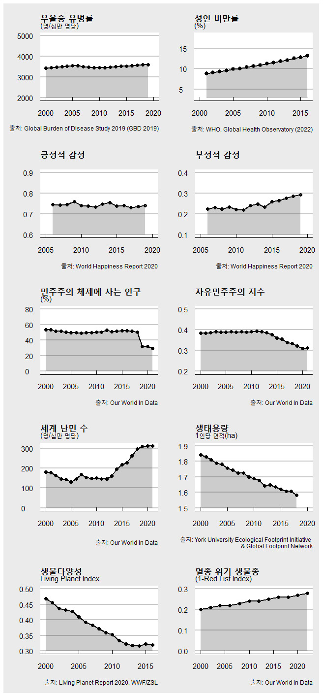 이 각각의 질문들에 로슬링이 그랬던 것처럼 “더 나빠졌다”, “큰 변함없다”, “더 좋아지고 있다”는 세 가지 선택지 중 하나를 고르게 했다면? 로슬링의 강연에 매료된 사람들이라면, 이 질문들에 이제는 더 좋아지고 있다는 대답을 대략 일관되게 내놓지 않았을까? 지난 20년 동안 줄어든 ‘극단적 빈곤’ 비율과 자연재해 사망자 수처럼, 우울증과 비만, 부정적 감정 경험은 줄어들고, 세상은 더 민주적으로 변하며, 환경 문제도 꾸준히 진보하고 있을 것만 같은 느낌이 들지 않는가? 만약 그런 느낌을 따라 저 10가지 항목 모두에서 세상이 더 좋아지고 있다고 대답했다면, 당신의 정답률은 0%다. 실제로는 이 항목들은 지난 20년 사이에 큰 변화 없이 거의 일정하거나(우울증, 긍정적 감정), 혹은 더 나빠진(비만, 부정적 감정, 민주주의, 난민, 생태용량, 생물 다양성, 멸종) 지표들이다(‘감정’ 시계열은 2006년부터 시작한다는 점에 유의하라).