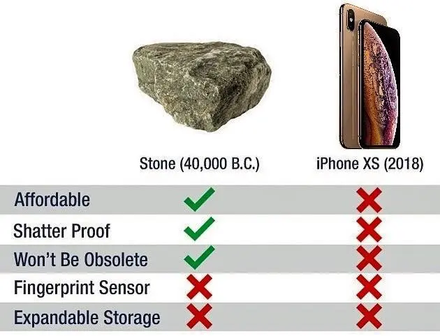 팩토이드는 물론 ‘팩트’의 형식을 취하지만, 팩트와 다르다. 팩트는 사실’관계’ 속에서 의미를 갖는다. 가령, 해외의 인터넷 커뮤니티에서 유행하는, 돌멩이와 아이폰을 비교하는 아래의 ‘밈’은, 사실관계가 결여된 단편적 사실(팩토이드)이 어떻게 부조리한 결론을 내놓을 수 있는지를 재치있게 보여준다. 신형 아이폰 모델에 비해 돌멩이가 더 저렴하고(“Affordable”), 내구성도 좋고(“Shatter Proof”), 새로운 신형 모델의 출시로 인해 가치가 떨어질 일도 없다(“Won’t Be Obsolete”). 하지만, 그 누구도 이런 비교로 아이폰 대신 돌멩이를 선택하지는 않는다. 아이폰 소비자들의 주된 이해관심은 통신 기능을 갖춘 장비를 구매하는 것이며, 가격과 내구성 따위는 모두 그 이해관심 하에서만 부차적인 관련을 갖는 사항이라는, 사실‘관계’가 고려되지 않은 비교이기 때문이다. 즉 ‘팩트’의 형식을 취하더라도, 적절한 사실관계와 맥락이 뒷받침되지 않는 팩토이드에는, 실질적 의미가 없다.