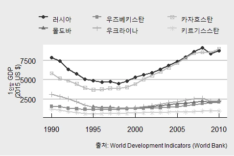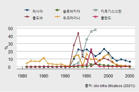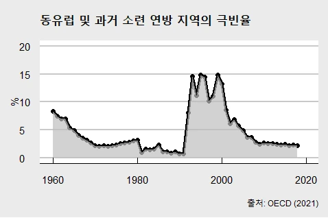 그림2에서 보듯, 이런 추세는 1991-2년경을 기점으로 한 극빈율의 상승으로 나타난다. 세계은행에서 출간한 연구들 역시 자본주의 이행 과정에서 동유럽과 중앙아시아의 옛 공산권 국가들의 빈곤율이 상승했다는 사실을 중요하게 논의할 정도다(Milanovic, 1998; Klugman & Braithwaite, 1998).