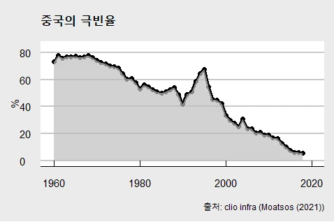 사실, 앨런(Allen, 2017)의 방법으로 새로 ‘극빈율’을 계산했던 모아소스(Moatsos, 2021)의 데이터에 의하면, 과거 소련 연방 국가들의 사례들만큼이나 극단적이지는 않았더라도, 중국 역시 자본주의 이행의 충격으로부터 아주 예외는 아니었다. 중국의 시장 경제로의 이행이 심화되는 90년대 초중반 경 모아소스 데이터의 ‘극빈율’이 치솟아 위로 뾰족한 뿔 모양의 그래프를 그리고 있는 것.