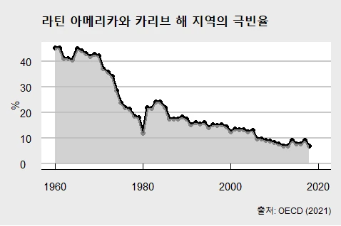 중국을 비롯한 동아시아 국가들에 비해 '워싱턴 컨센서스'의 아젠다들이 표준적으로 시행된 80년대 이후 라틴 아메리카의 사정 역시 중국과 크게 대조된다. 라틴 아메리카에서는 외채위기를 겪으며 1980년 즈음을 기점으로 무역 및 금융 자유화, 노동시장 개혁, 민영화 등의 '워싱턴 컨센서스'의 표준적인 정책들이 도입되었지만, 경제성장률은 오히려 '수입대체산업화'의 패러다임이 지배하던 1960-80년대보다도 낮아졌다. 구조조정 프로그램이 도입되기 시작하는 80년대 초 치솟은 극빈율은 2000년경까지도 1980년의 수준을 회복하지 못한다(그림6).