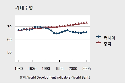 계획경제 체제에서 시장경제로의 이행을 비슷한 시기에 겪으면서도, IMF 등의 권고 하에 중국과는 달리 급격하고 전면적인 민영화와 시장화의 길을 걸었던 구소련 국가들의 발전상은 중국과 극명히 대조된다. 사회주의 ‘철밥통’의 보호를 받다가 자본주의 시장에 무방비로 노출된 구소련 시민들의 충격은 사망률 통계에서 고스란히 드러난다. 그림3을 보라. 기대수명이 꾸준히 상승하고 있는 중국에 비해, 러시아는 사망률의 상승으로 인해 기대수명 그래프가 움푹 패인 골을 만들고 있다. 러시아의 기대수명은 2010년경이 되어서야 소련 붕괴 이전의 고점을 회복한다. 저명한 의학 저널 란셋(The Lancet)에 게재되기도 한 사회학자 스터클러(David Stuckler) 등의 연구는, 러시아뿐 아니라 동유럽 및 과거 소련 출신의 여러 국가들에서, 체제이행기의 급격한 민영화가 노동연령층 남성의 사망률 증가로 이어지는 유의미한 통계적 관계를 발견한 바 있다(Stuckler, King & McKee, 2009; Azarova et al. 2017).