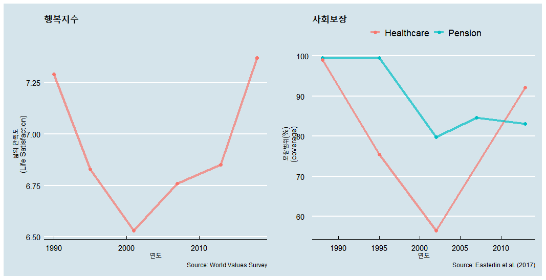 사실, 이스털린의 지적 이전에도 유럽 국가들 사이에서는 사회안전망이 행복과 유의미한 통계적 관계가 있다는 사실은 알려져 있었다(DiTella, MacCulloch & Oswald, 2003). 국가와 연도 등 조사단위의 상수적 효과(고정효과)를 고려한 모형에서, 실업보험의 소득대체율은 일관되게 유럽 국가들의 행복도를 높여준 것으로 나타난다. 뿐만 아니라, 실업급여의 수급자만이 그 득을 보는 것이 아니고, 비실업자들의 표본에서도 소득대체율이 높아질수록 더 행복해지는 현상이 나타났다. 미래에 닥칠지 모르는 실업에 대한 안전망이 사회 전반의 불안을 실제로 줄여주는 역할을 한 것.