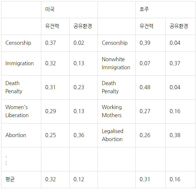 28개 항목의 정치 성향 차이에서 이 유전력이 평균적으로 대략 32% 정도라는 게 미국 쌍둥이 표본으로부터 나온 결과였으며, 28개 항목을 종합하여 진보-보수 성향을 1차원의 연속점수로 산출, 피어슨 상관계수로 계산하면 유전력은 43% 정도였다. 표1에서 볼 수 있듯, 호주의 쌍둥이 표본에서도 결과는 크게 다르지 않았다.