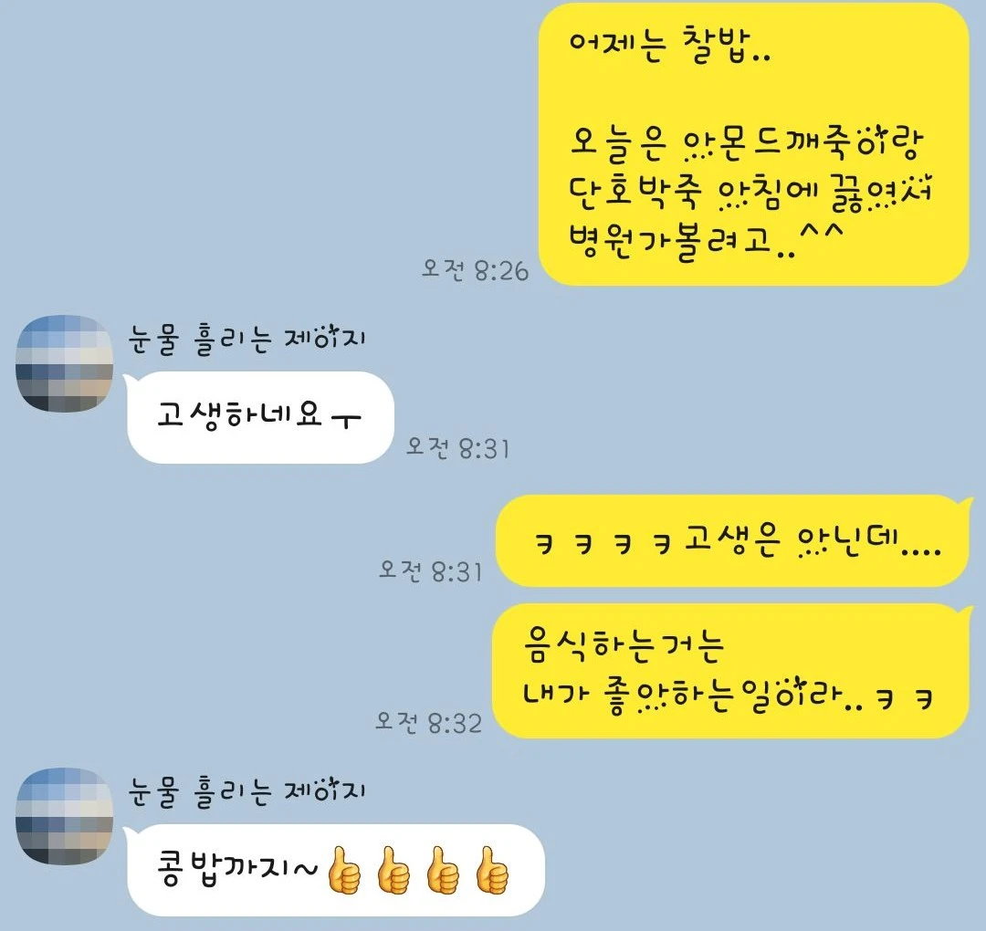 그 도시락에 대해 돌아온 지인의 반응은 다름 아닌 "고생한다"였다. 나는 고생하지 않는데, 도시락 싸는 게 왜 고생이지? 그냥 어머님 드실 식사를 밀폐용기에 옮겨 닮았을 뿐인데.. 고생했다는 말을 들었을 때 난 솔직히 뭔가 찜찜했다.