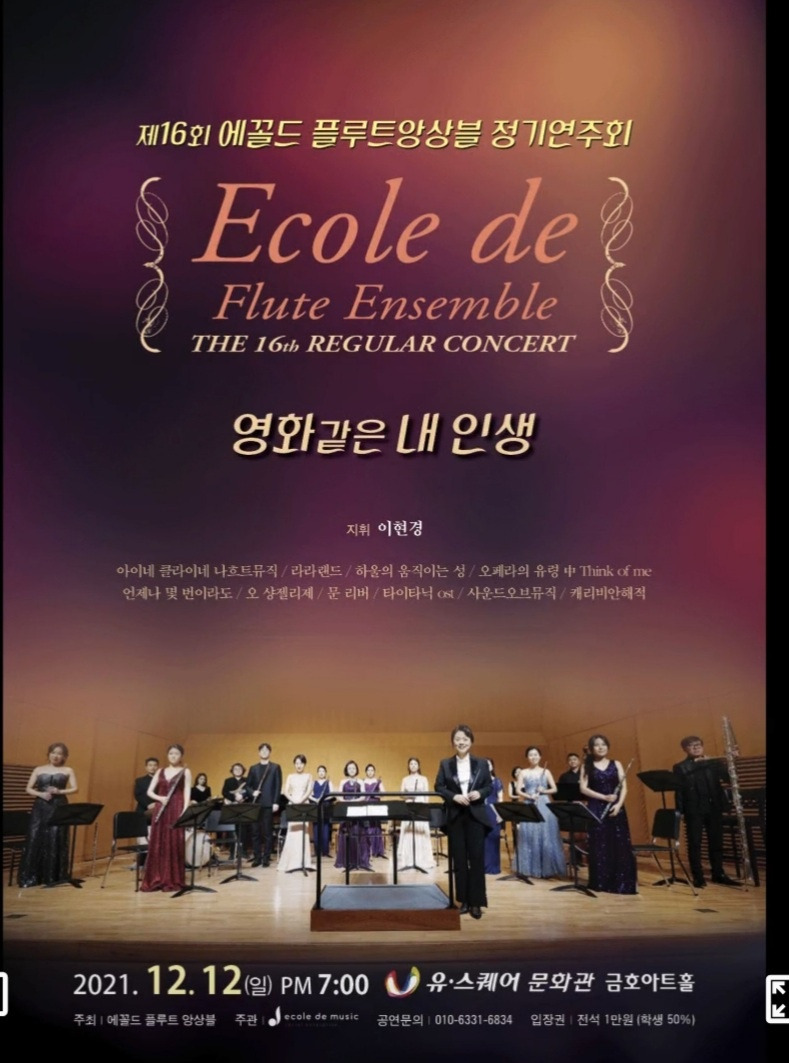 지휘자가 음악회를 왜 이렇게 구성했는지를 자세히 설명해 주었다. 코로나가 장기화되면서 학생들과 일반인을 대상으로 악기 연주를 가르쳐 주는 바우처 일을 시작했다고 한다. 3월에 처음 시작할 때만 해도 악기 소리도 제대로 못 내어 계속할 수 있을까 우려가 많았는데, 8개월 만에 무대에 서게 되었다는 것이다. 물론 전문 연주가에 비하면 소리도 제대로 못 내지만 연습해서 무대에 서는 것 자체만으로도 교육적 효과와 성취감이 크다는 이야기를 했다. 특히 어린 학생들의 경우에는 이렇게 본인들이 노력해서 무대에 서 본 경험들이 앞으로 다른 일을 할 때에도 자신감을 부여해 주어, 어려운 일도 도전해 볼 용기를 준다고 했다. 시니어 연주자의 경우에는 어린 학생들보다도 박자도 제대로 못 맞추었지만, 다들 눈이 부시게 멋진 옷을 차려입고 인생의 반짝이는 아름다움을 보여 주었다. 영화 같은 내 인생이라는 부제가 붙은 연주회답게 귀에 익은 영화 OST로 구성된 플루트 연주는 아름다웠다. 오랜만에 클래식 음악이 주는 즐거움을 누리고 온 연주회였다. 연주 수준은 정말 엄청난 차이가 있었지만, 현장에서 보고 듣기에는 나름 다 괜찮았다.