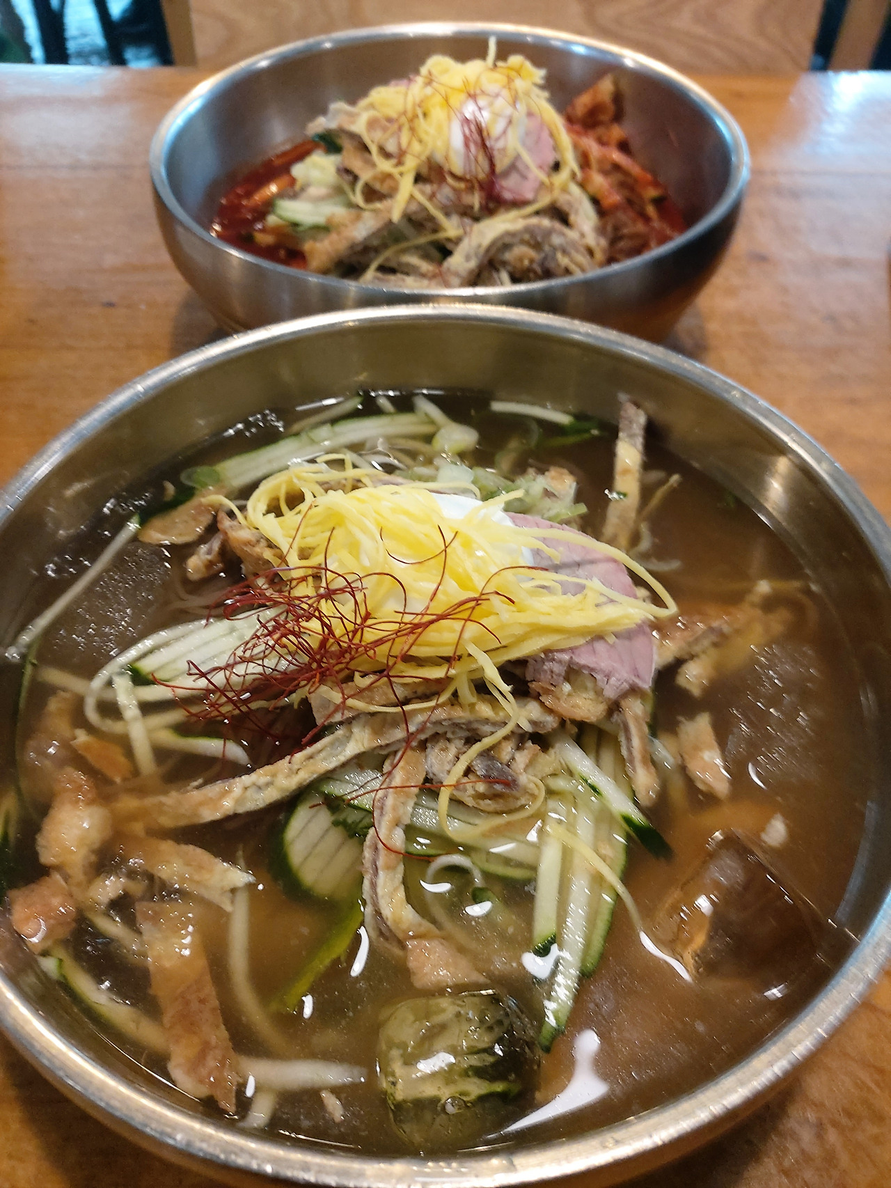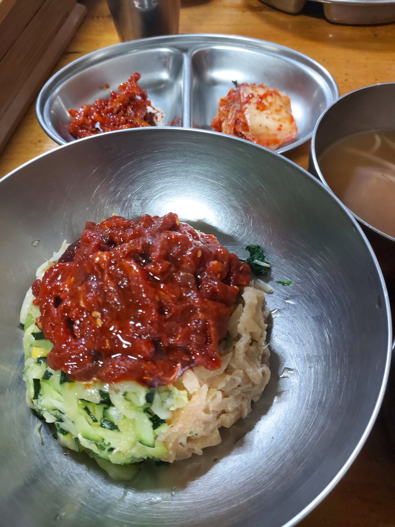 모든 지역은 그 지역을 대표하는 음식이 있다. 내가 지금 살고 있는 나주는 곰탕으로 유명한데, 진주는 진주냉면과 진주비빔밥이 유명하다고 한다. 그래서 일단 진주냉면을 먹으러 갔다. 하연옥이라고 진주냉면을 대표한다는 집으로 갔는데, 음식점도 크고 손님도 많았다. 진주냉면은 소고기 육수나 동치미 육수를 쓰는 일반적인 냉면과 다르게 해물육수를 사용한다고 한다. 그리고 고명으로 특이하게 육전을 잘라서 사용하고 있다. 아직 냉면의 진정한 맛을 모르기 때문에 어느 냉면이 더 맛있다고 말하기는 어렵다. 진주냉면은 양도 많고 시원하기는 하지만, 특별히 더 맛있지는 않았다.