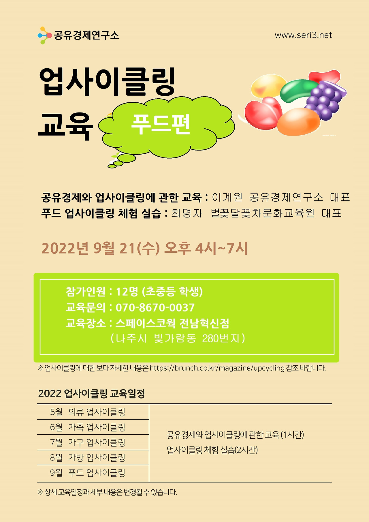업사이클링 교육의 5번째 마지막 교육으로 푸드 업사이클링 교육을 9월에 진행하였다. 이번 교육은 지난번 교육들과는 좀 다르게 초중등학생들을 대상으로 진행하였다. 사실 푸드 업사이클링 교육을 처음부터 어린 학생들을 대상으로 하려고 했던 것은 아니었다. 다른 업사이클링 교육과 동일하게 성인들을 대상으로 하려고 생각하고 있었는데, 갑자기 퐁퐁이라는 지역 학부모 동아리에서 초등학생과 중학생 대상으로 푸드 업사이클링 교육을 해 줄 수 있느냐는 요청이 왔다. 어린 학생들을 가르쳐 본 적이 없어서 조금 부담스럽기는 했는데, 그래도 아이들의 교육에 도움이 되라고 수락했다. 어린 학생들일수록 푸드 업사이클링 교육을 통하여 환경과 건강을 동시에 지키는 방법을 알 필요가 있을 것 같았다.