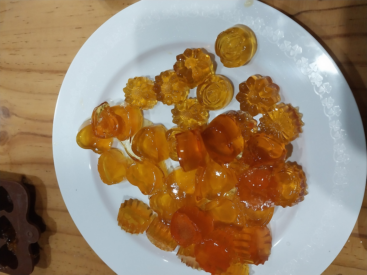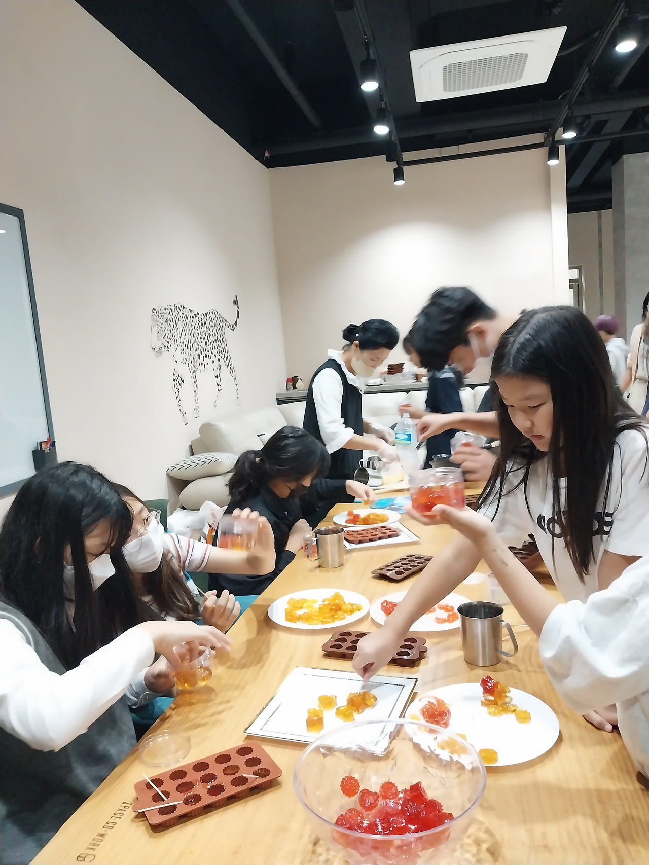 본격적인 푸드 실습으로 젤리 만들기를 하였다. 먼저 최명자 선생님이 꽃차 시럽과 생수에 곤약가루를 섞어서 중탕하는 방법을 알려 주셨다. 중탕된 재료를 아이들이 각자의 모양 틀에 부어서 식혔다. 다 식힌 다음에 굳어지면 틀에서 빼어냈다. 생각보다 쉽고 간단하게 모양과 색이 아름다운 젤리가 만들어졌다. 동백꽃 시럽을 사용한 젤리는 좀 더 붉은색에 가까웠고, 황화 코스모스라고 노란색 꽃 시럽을 사용한 젤리는 황금 호박색에 가까운 아름다운 색이 나왔다.