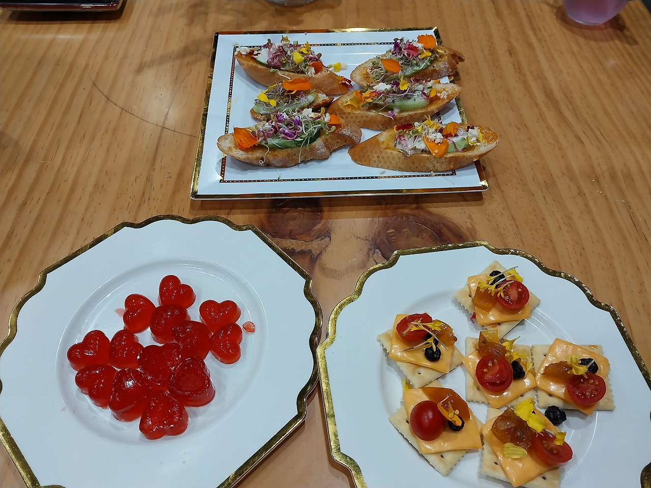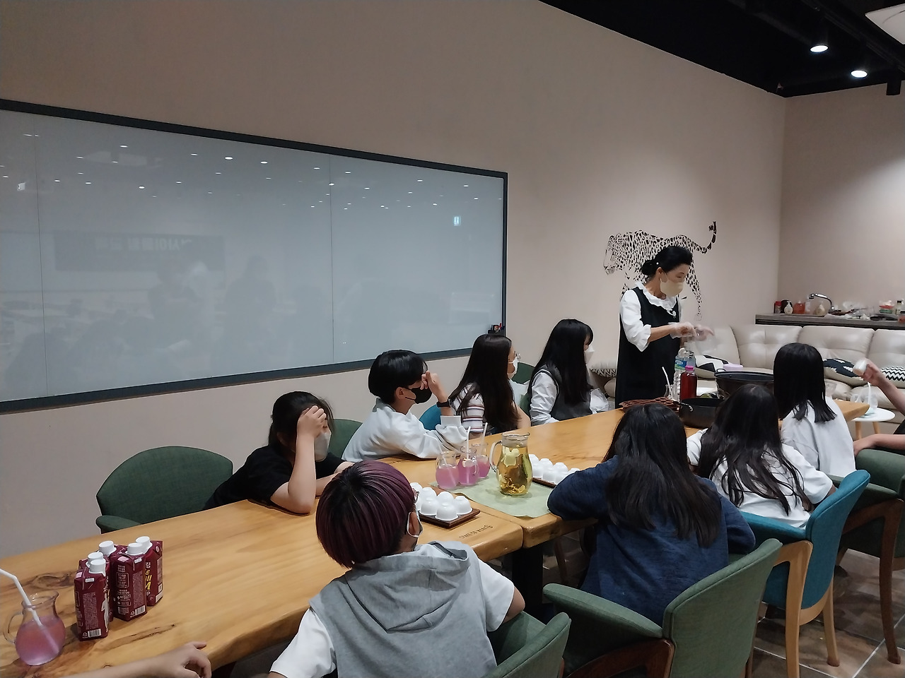 이번 푸드 업사이클링 실습은 최명자 별꽃달꽃차문화교육원 대표가 진행해 주셨다. 조리도구부터 아이들 간식까지 많은 것들을 준비해 오셨다. 아이들 배 고플까 봐 교육에 들어가기 전에 꽃으로 만든 오픈 샌드위치와 카나페, 젤리, 시원한 꽃차 에이드 등을 간식으로 먼저 주었다.