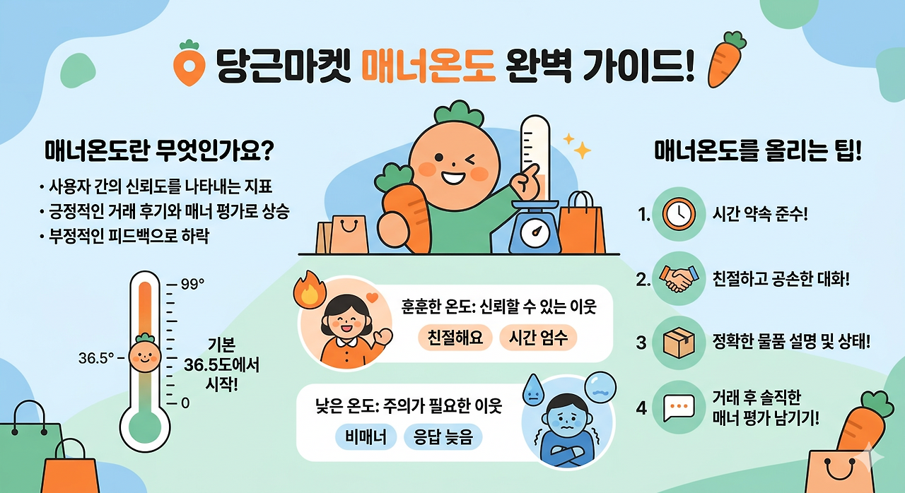 당근마켓에서 매너온도를 높이는 방법은 여러 가지가 있다. 당근마켓의 매너온도는 따뜻한 거래(친절, 시간 준수, 거래량) 시 상승하며, 비매너 평가나 낮은 활동량 시 하락한다. 일반적으로 36.5℃ 미만은 주의가 필요하며, 40℃ 이상은 신뢰할 수 있는 사용자로 간주된다.