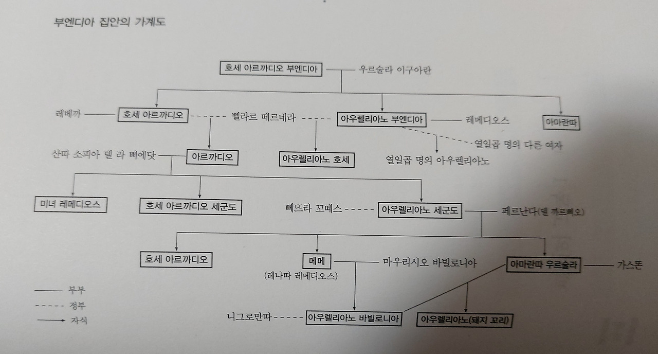 "무얼 바랐었니?" 우르슬라가 한숨을 내쉬었다. "세월이란 흐르게 마련이다" "그래요" 아우렐리아노가 수긍했다. "하지만 그리 빨리 흐르진 않죠"
