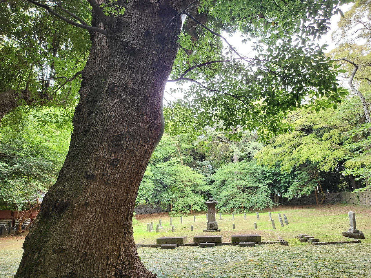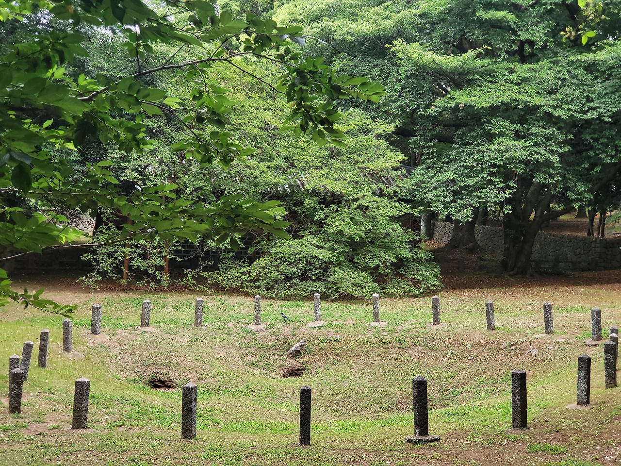 녹나무 뒤로 경건하게 놓여있는 세 개의 구멍 보이니?
