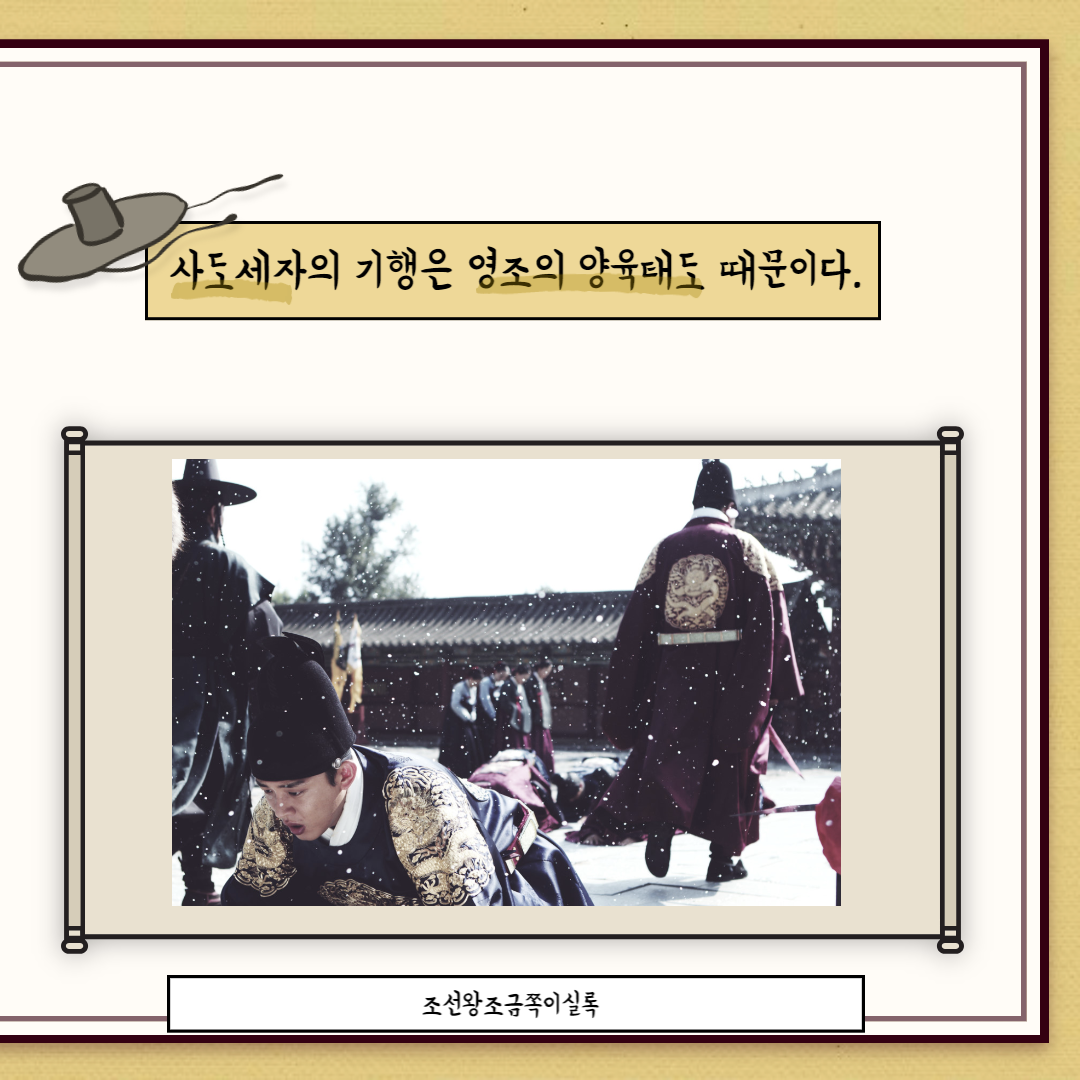 '훈육'이란 아이를 특정한 인성이나 행동 특성을 갖도록 기르는 것을 말한다. 저마다의 스타일이 있겠으나 아이가 잘 되게 하려고 하는 멸시와 질책은 목적과 수단이 맞지 않다는 것쯤은 다들 알고 있다. 영조가 사도세자를 멋진 왕으로 교육하기 위해 내비쳤던 폭언과 질책 그리고 멸시 가득한 표정은 결국 파국으로 몰고 갔으니까 말이다. 더욱이 자신이 가지고 있는 콤플렉스를 지우기 위해 미친듯 살아가는 방식을 아이에게 강요해서는 안 될 것이다. 사도세자를 금쪽이로 만든 것은 결국 조선 원탑 금쪽이 영조였을 지도 모르겠다.