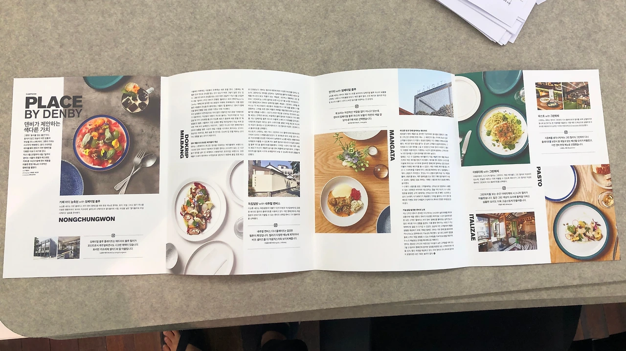 영국 테이블웨더 브랜드인 ‘덴비’와 <올리브> 매거진이 협업한 오프라인 캠페인도 내 담당이었다. ‘플레이스 바이 덴비’ 캠페인은 서울의 주요 레스토랑과 협업을 맺고 2주간 스탬프 미식 투어 콘셉트 형태로 진행됐다. 캠페인 기간 동안 협업을 맺은 14곳의 레스토랑에 방문하면 매장별 메인 메뉴를 덴비의 테이블웨어 제품과 함께 즐길 수 있었다. 캠페인에 참여할 대표 레스토랑 다섯 곳을 섭외하는 일부터, 레스토랑에 제공할 덴비 테이블웨어를 셰프님들과 협의하는 과정 모두를 솔비와 지현이를 이끌고 진행했다. 캠페인 메인 비주얼을 기획하고 레스토랑을 돌며 인스타그램과 유튜브 홍보에 사용할 영상을 제작하는 일도 마찬가지였다.