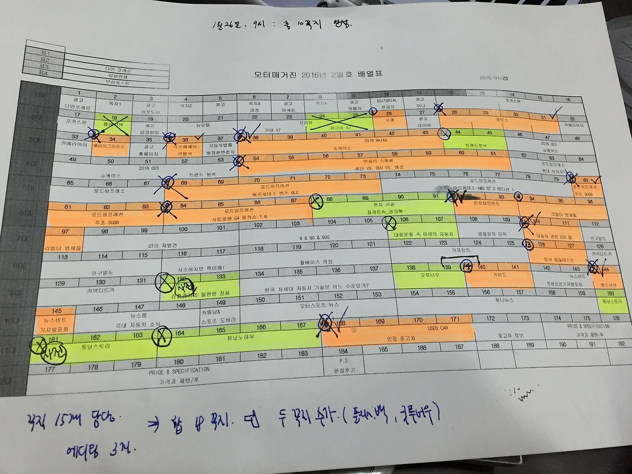 1월 호 마감부터 퇴사를 앞둔 준혁 선배의 배당이 줄고 내 배당이 늘어난 건 당연한 수순이었다. 애초에 <모터매거진>에 에디터라고는 둘 뿐이었다. 프리랜서 선배들이 힘을 보태긴 했어도 최종 편집은 내부에서 담당해야 했다. 두꺼운 패션 매거진 기준으로도 한 명의 에디터가 담당하는 칼럼은 매달 많아야 10 꼭지였다. 에디터는 취재도 해야 하고 촬영도 해야 하며 행사도 다니고 사람도 만나야 한다. 촬영하고 원고만 쓴다고 해도 10 꼭지는 상당히 부담스럽다. 그런데 선배가 퇴사한 2월 호 제작부터는 내 배당이 20 꼭지에 육박하기 시작했다. 많은 달엔 무려 23 꼭지에 달했다.