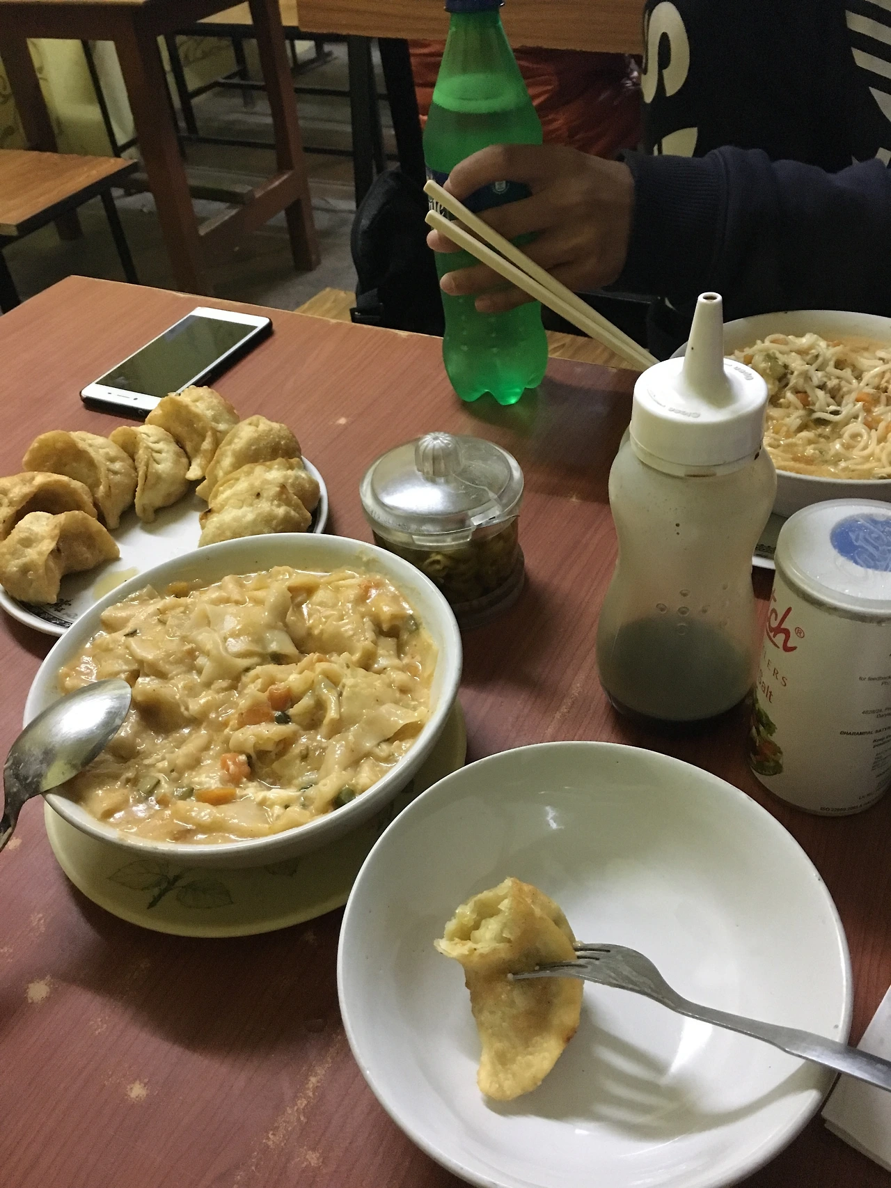 나는 저녁에 한식당에서 만난 한 여학생과 먼저 만나기로 약속이 되어 있었다. 티베탄 식당에는 모모, 뚝바, 뗌뚝이라는 걸 주로 팔았는데 모모는 우리나라로 치면 만두였고 뚝바는 칼국수, 뗌뚝은 수제비였다. 모양 뿐 아니라 맛도 비슷해 여행 내내 아주 즐겨 먹었던 음식이었다. 심지어 이 티베트 식당은 한국인들을 호객하기 위해 뗌뚝과 뚝바가 아니라 대놓고 수제비와 만두국을 판다고 가게 문 앞에 적어 놓기까지 했다. 메뉴판에도 칼국수(Tuppa), 수제비(Thentuk)이라고... ‘여기가 대체 한국이야 인도야?’