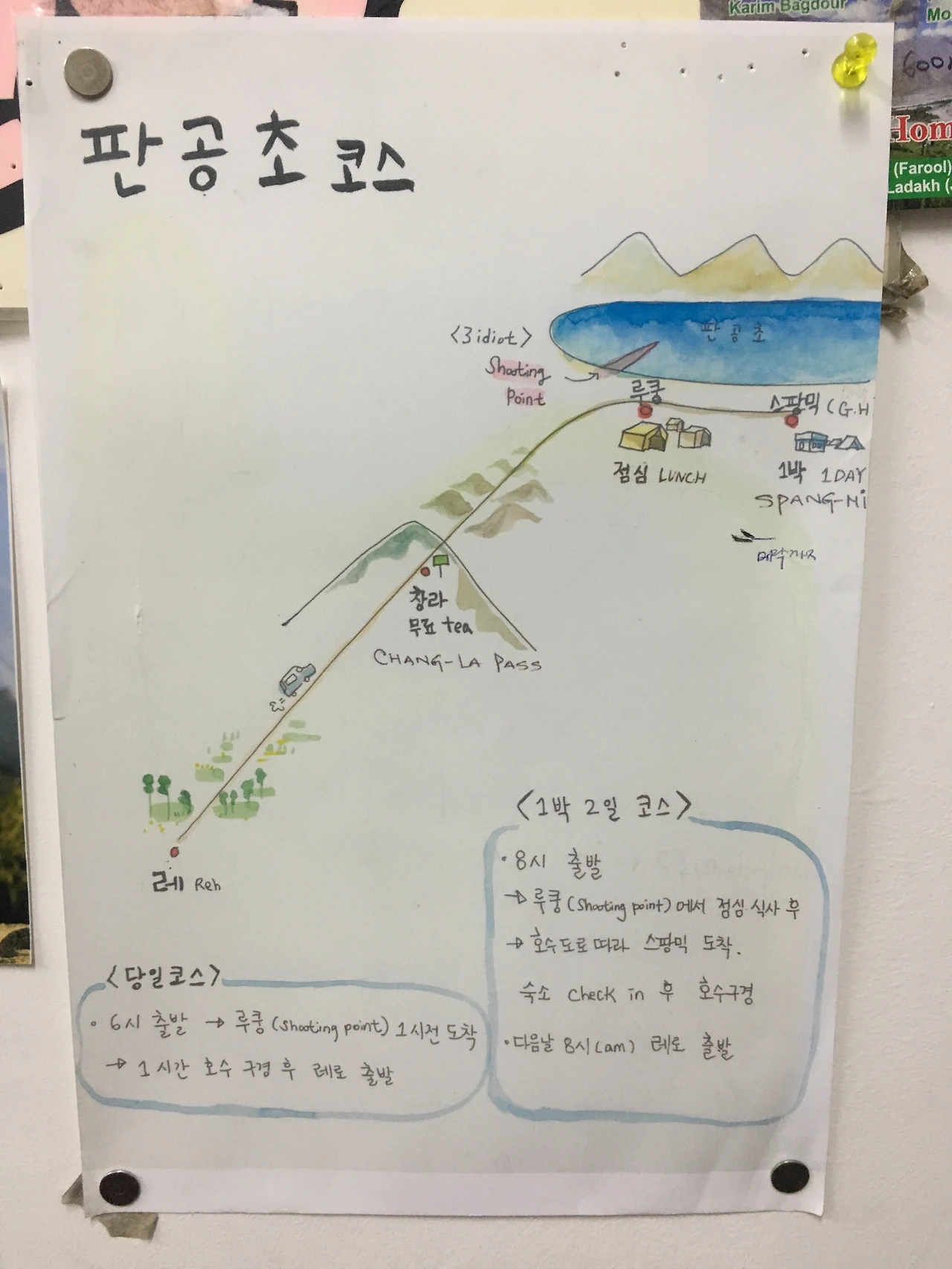사실 레를 온 이유는 판공초를 보기 위해서였다. 한국에서 나름 인기 있는 인도 영화 '세 얼간이'의 엔딩 배경이 된 판공초는 여름에 인도를 여행하는 한국 여행자에게 특히 인기 있는 곳이었다.