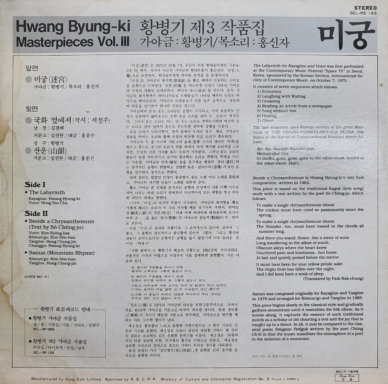 황병기의 작품집은 1집부터 3집까지 소장하고 있다. 1집 <가야금 작품집>은 1978년에 나왔고 2집 <가야금 작품집 / 비단길>은 1980년 그리고 대망의 문제작 3집 <제3 작품집 / 미궁>은 1984년에 나왔다. <미궁>은 1975년에 지금은 명동예술극장인 명동 국립극장에서 초연하였으며 기존의 1집과 2집에서 선보인 황병기의 가야금 연주와는 차원이 다른 세계로 인도하는 탓에 실제로 공연 때 귀신을 봤다며 소리를 지르고 공연장은 나가는 관객도 있었으며 내가 초등학교를 다닐 때 '이 곡을 들으면 금방 죽는다.' 혹은 '이 곡을 들었던 사람이 자살을 했다.'라는 식의 소문이 끊이지 않았다.