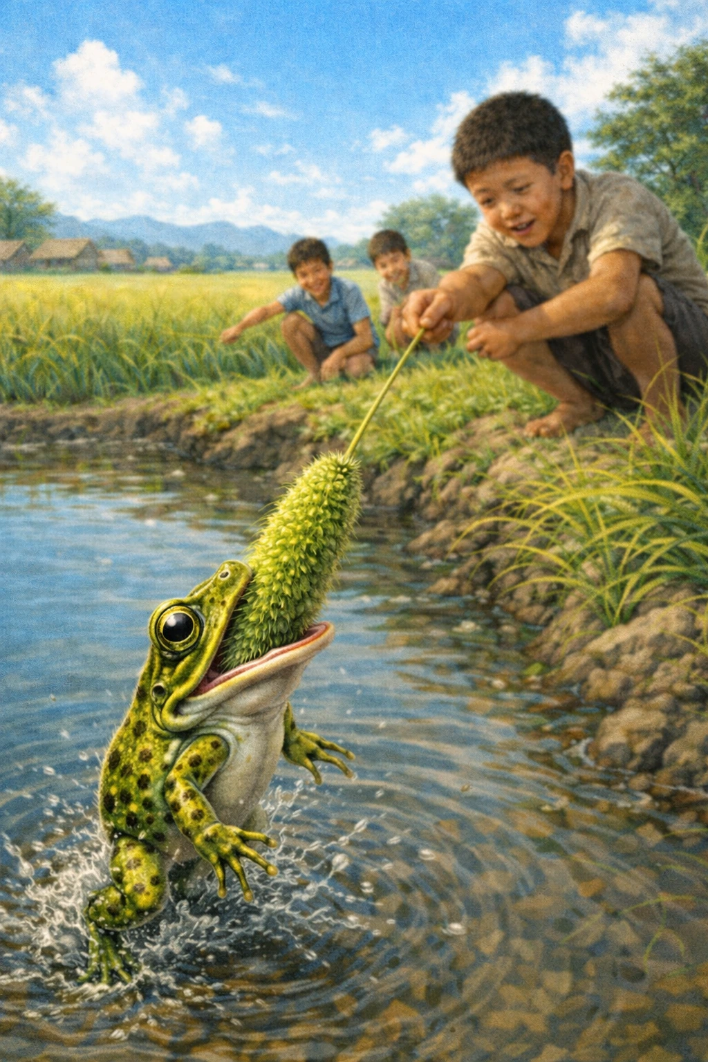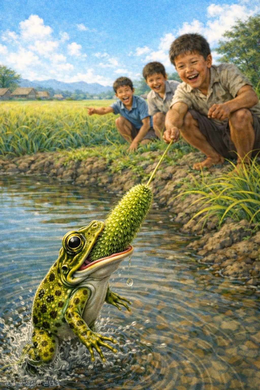 입이 벌어지는 순간, 젖은 분홍빛 입안이 번쩍 드러났다. 논개구리는 망설임 없이 강아지풀을 덮쳤다. 그것은 배고픔이라기보다, 움직이는 것을 향해 곧장 튀어 오르는 본능의 돌진이었다. 짧은 파문이 물 위에 퍼졌다. 물방울이 햇빛 속으로 튀어 올라 작은 유리 조각처럼 반짝였다가 다시 가라앉았다. 그제야 아이들의 웃음이 터졌다. 논둑 위에 엎드려 숨을 죽이고 있던 친구들이 동시에 고개를 들었다. 그들의 얼굴에는 햇살보다 더 환한 기쁨이 번져 있었다.