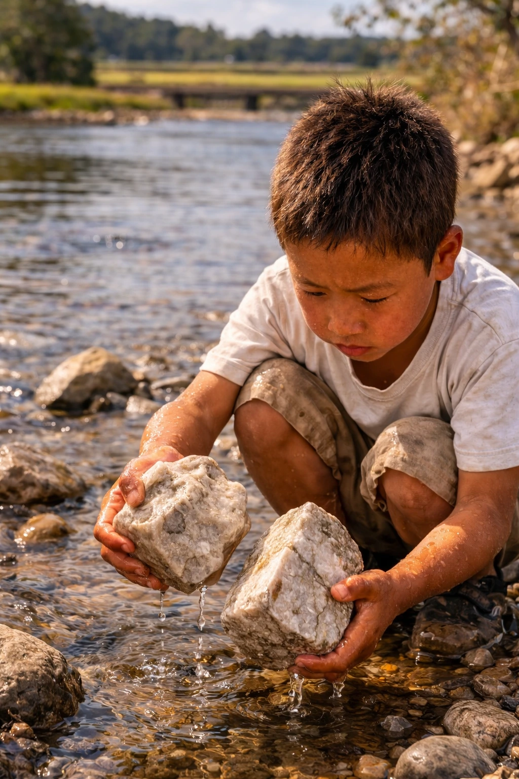 When a hand slipped into the water and turned over the pebbles, a stone unusually white and hard would sometimes appear. The back of the child’s hand was beaded with droplets, and tiny grains of sand clung between the fingers. Yet the child’s gaze rested only on the stone. As if searching for something hidden within that pale rock, the child narrowed their eyes and slowly examined its surface.