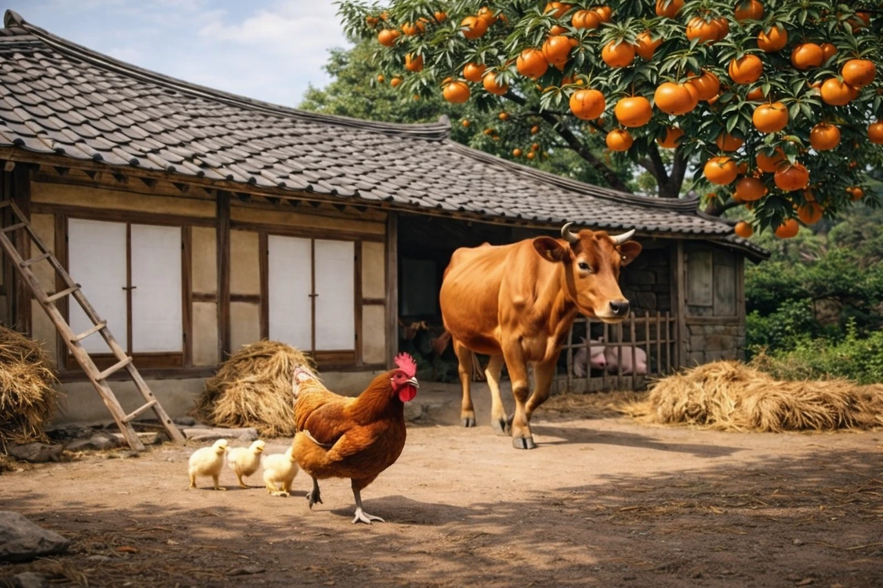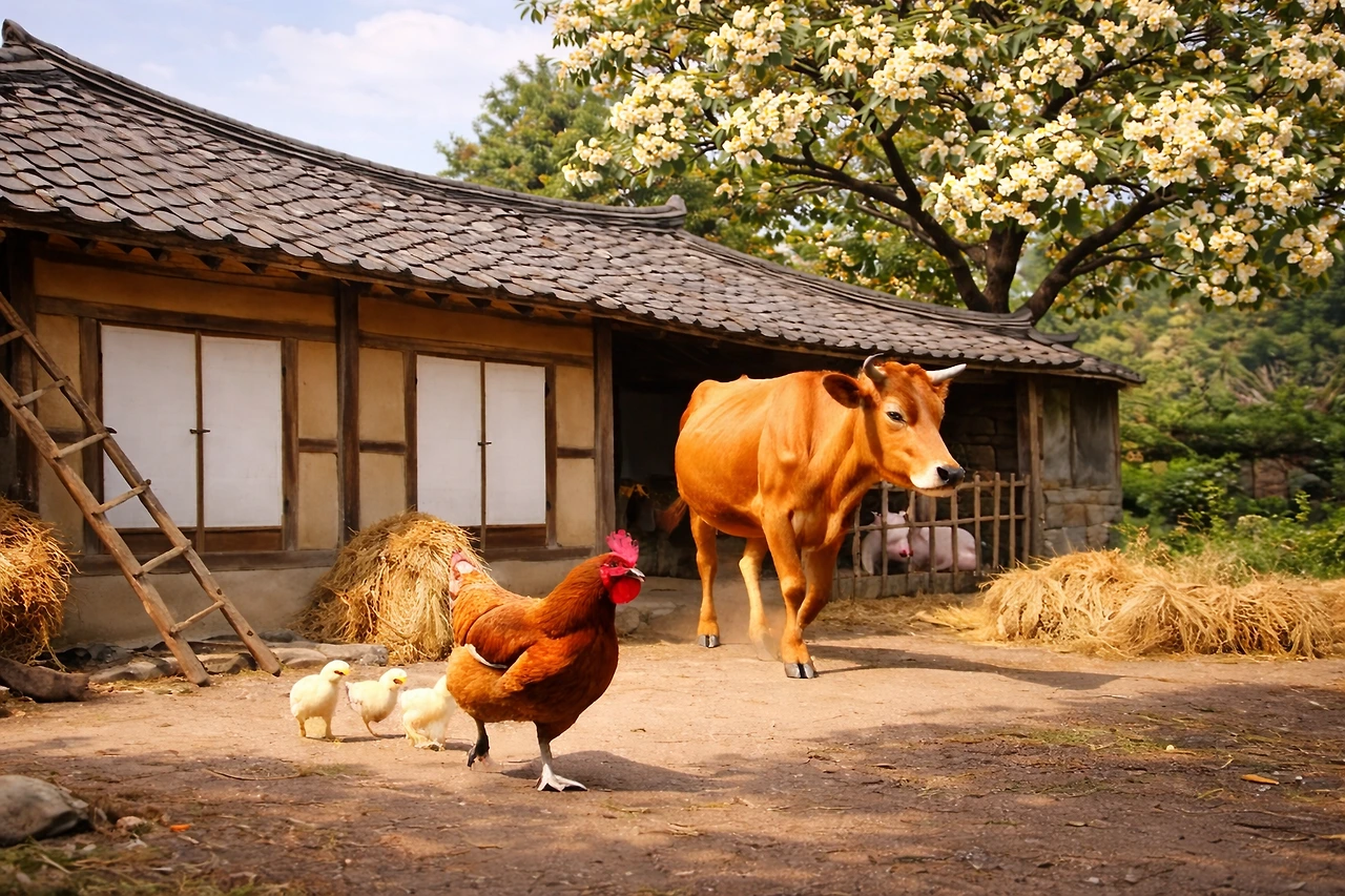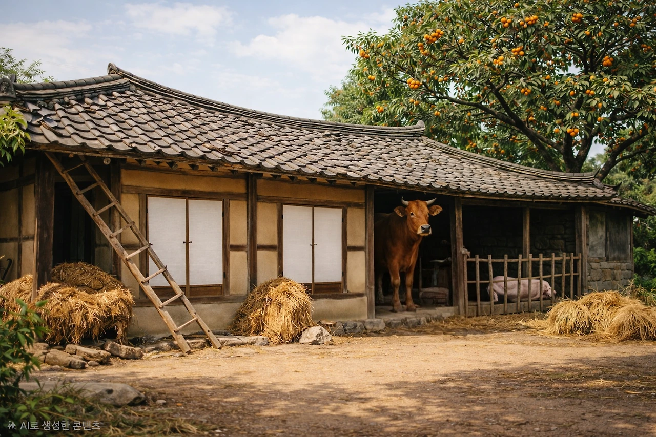 집 오른쪽 처마 아래에는 작은 축사가 이어져 있었다. 그늘 속에서 황갈색 소 한 마리가 고개를 내밀고 있었다. 느리고 깊은 눈으로 마당을 바라보며, 천천히 여물을 씹는 모습은 한없이 평온했다. 옆의 돼지우리에서는 검은털의 돼지 두 마리가 볏짚 위에 몸을 기대고 조용히 낮잠을 자고 있었다. 가끔 들리는 바스락거림이 고요를 깨뜨릴 뿐, 마당은 여전히 잔잔한 숨결 속에 잠겨 있었다.