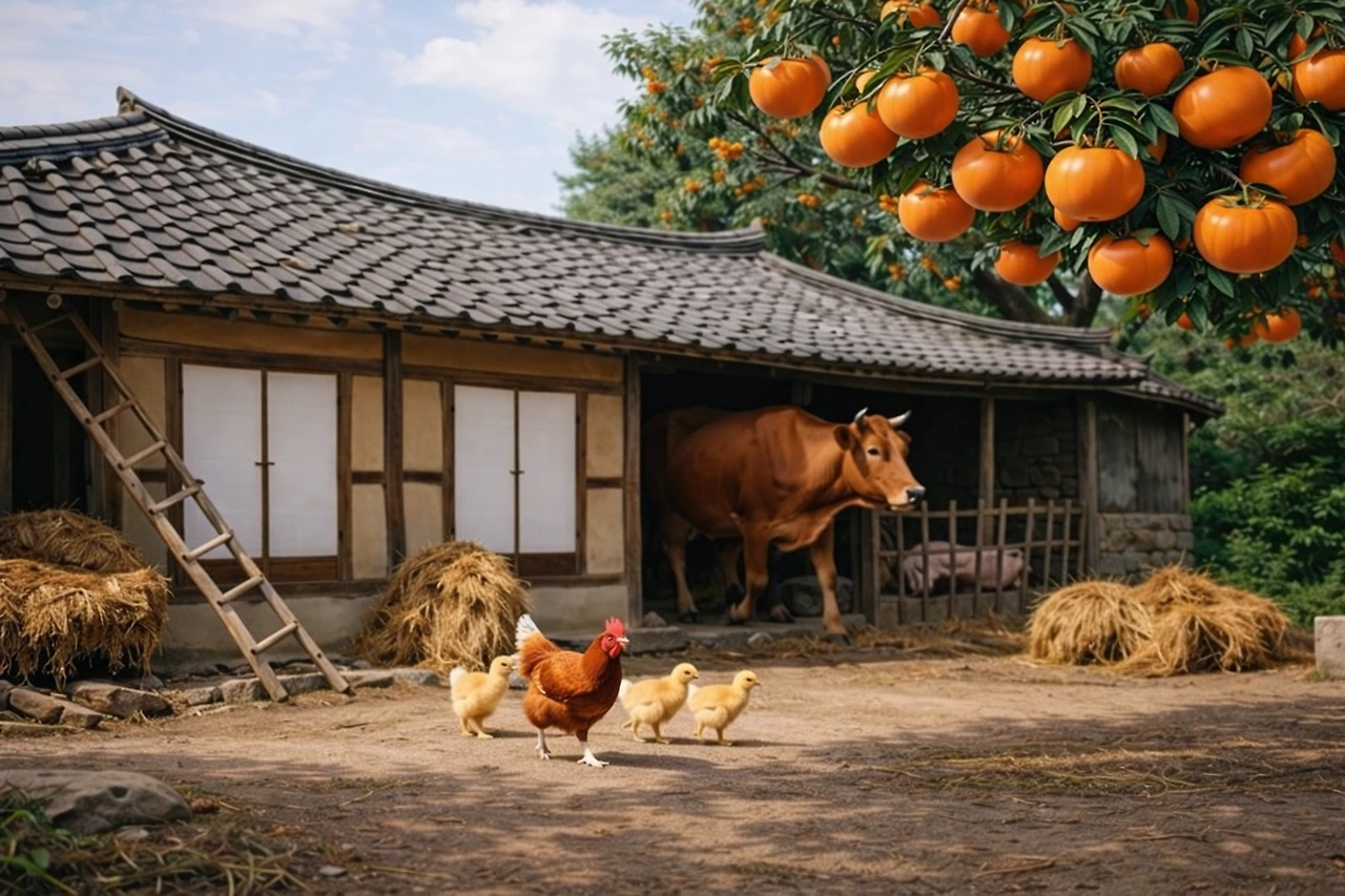 마당 뒤편에는 커다란 대봉 감나무 한 그루가 서 있었다. 굵게 갈라진 나무껍질과 넓게 뻗은 가지들은 이 집과 같은 시간을 살아온 듯했다. 여름이면 짙은 잎으로 그늘을 만들고, 가을이면 둥근 감을 주렁주렁 매달아 계절의 깊이를 드러냈다. 바람이 불 때마다 잎들이 스치는 소리가 낮게 울렸고, 가지 끝의 감들은 천천히 흔들리며 익어 갔다.