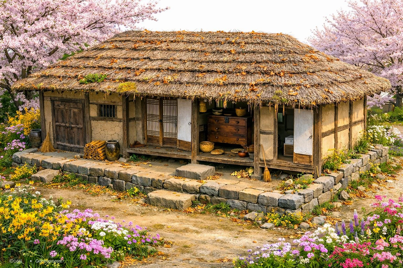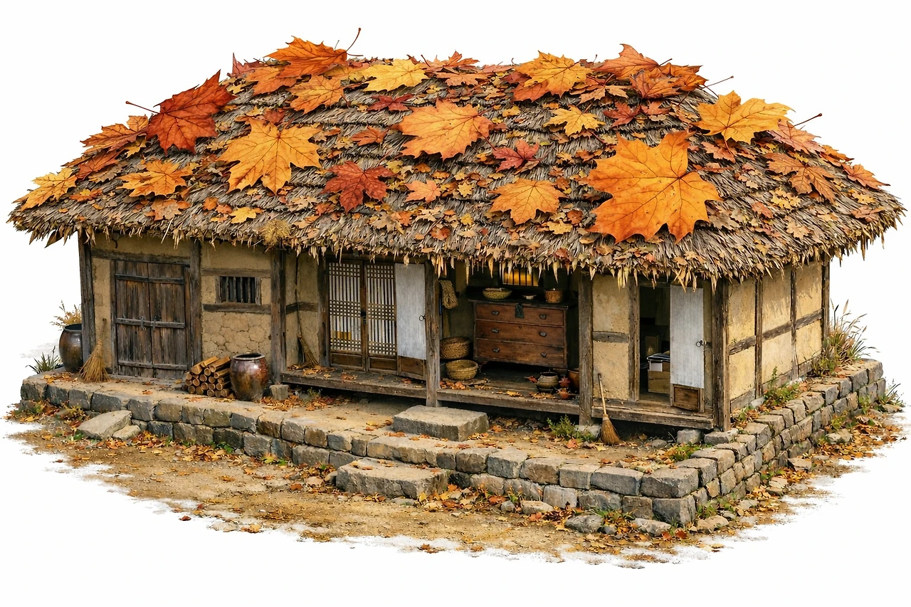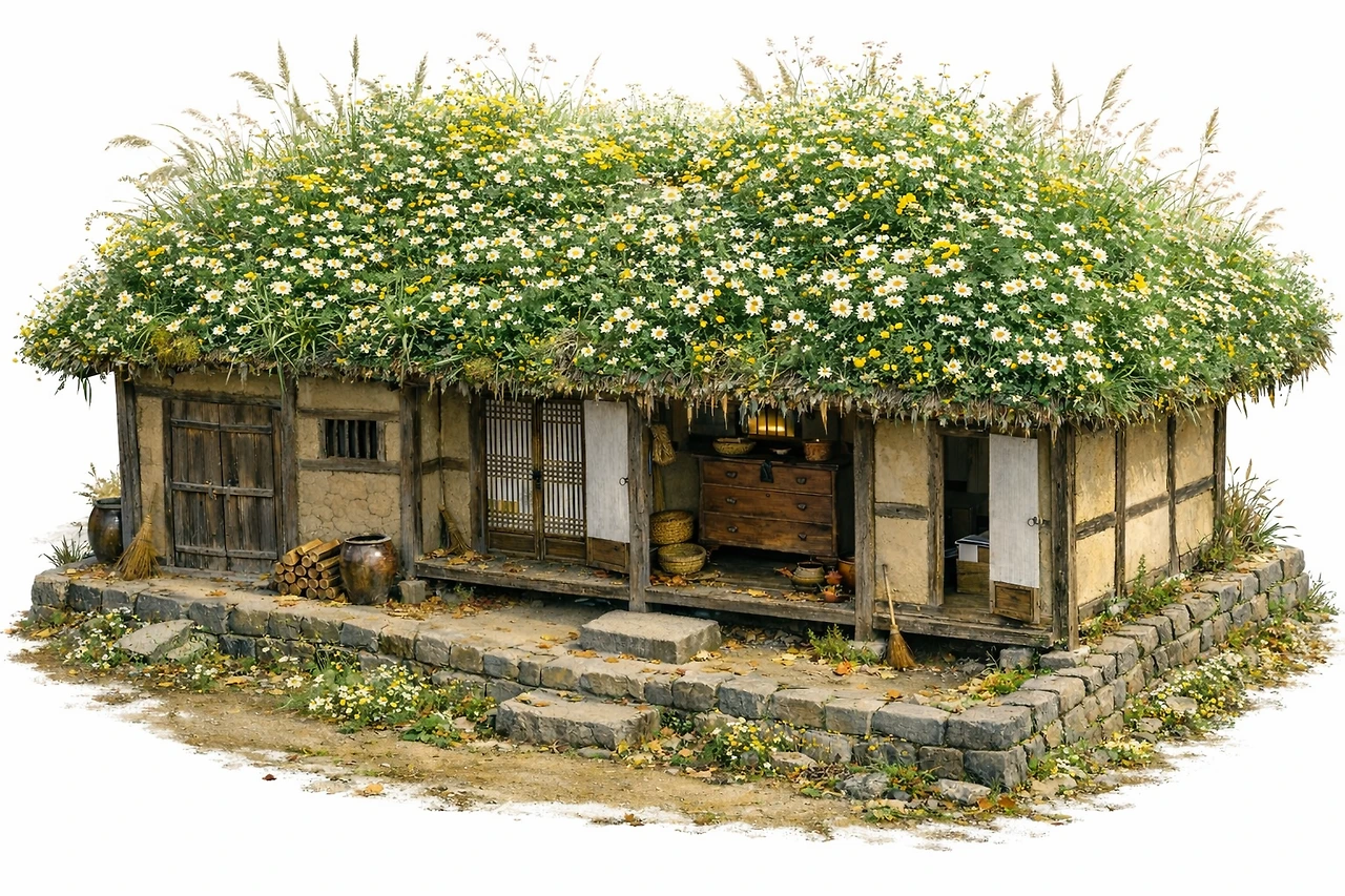 지붕은 두툼한 볏짚으로 덮인 초가였다. 오래된 짚 사이로 잡초들이 드문드문 자라 있었고, 바람이 불면 그 풀들이 먼저 흔들린 뒤 초가지붕 전체가 천천히 물결처럼 일렁였다. 어린 나는 그 모습을 보며 집이 숨을 쉰다고 생각했다.