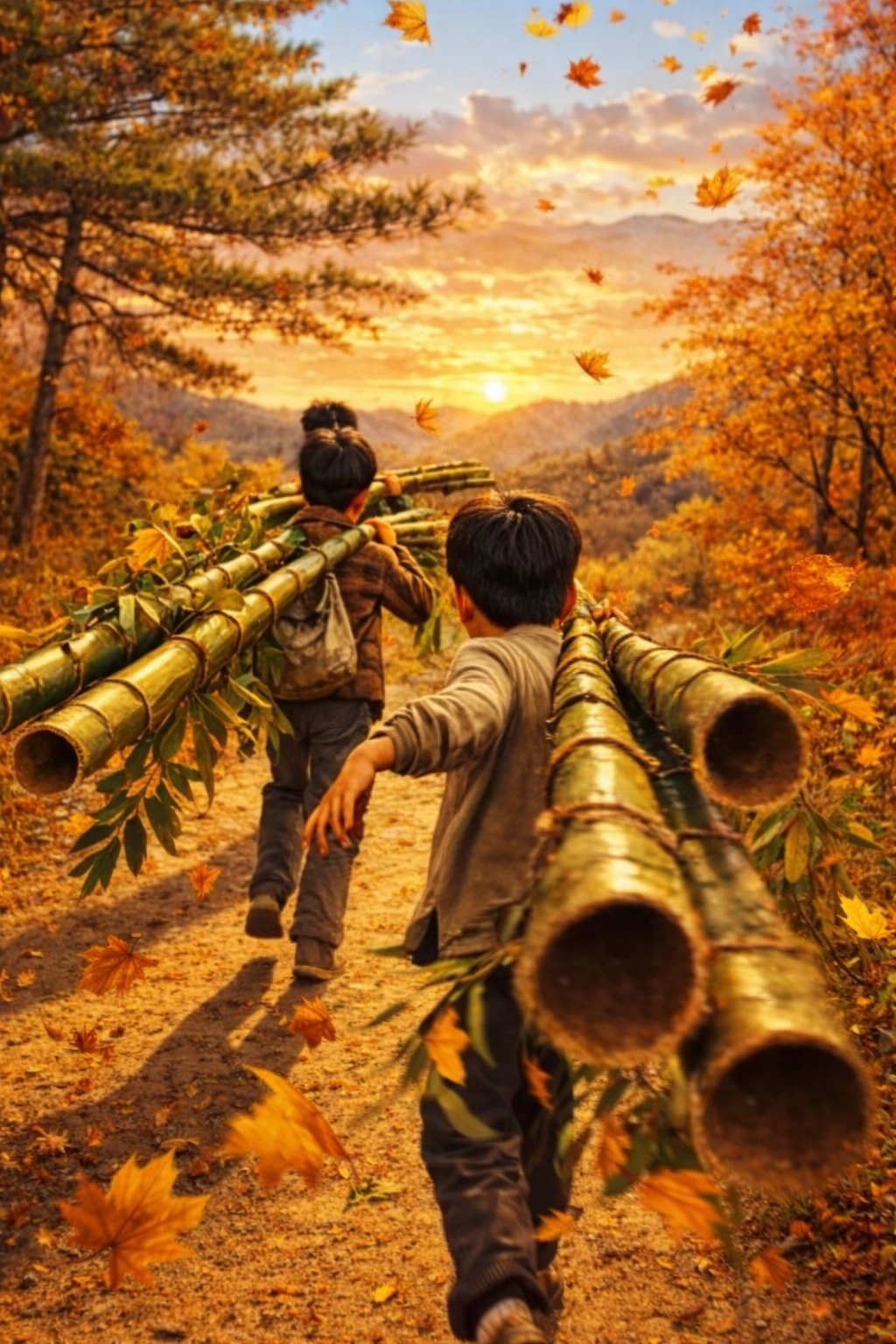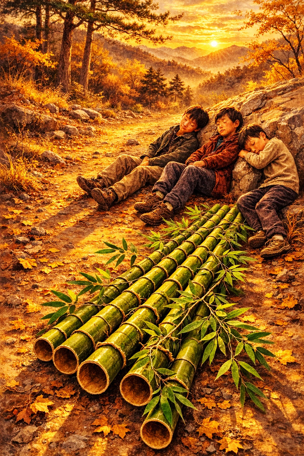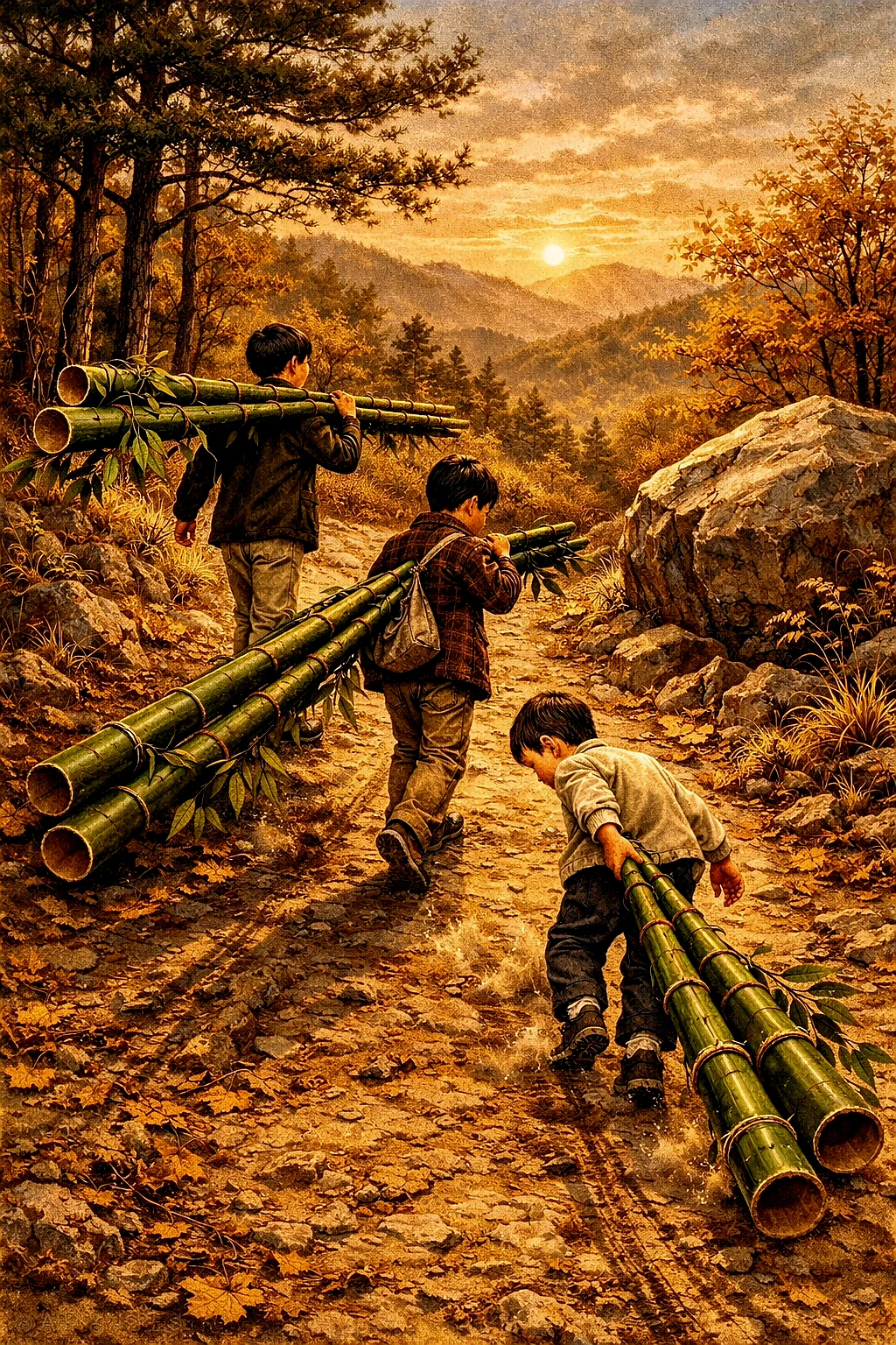 함양 외할머니 댁에는 대나무가 무성했다. 우리는 그 대나무를 꺾어 거창 송변마을까지, 네 시간 넘는 산길을 걸어 옮기곤 했다. 왜 그토록 대나무를 가져왔는지, 어디에 쓰였는지는 이제 기억에도 희미하다. 다만, 석양 속에서 길게 드리워지던 그림자와, 어깨를 짓누르던 그 무게, 그리고 “조금만 더 가면 된다”던 목소리만이 아직도 마음속에 남아 있다.