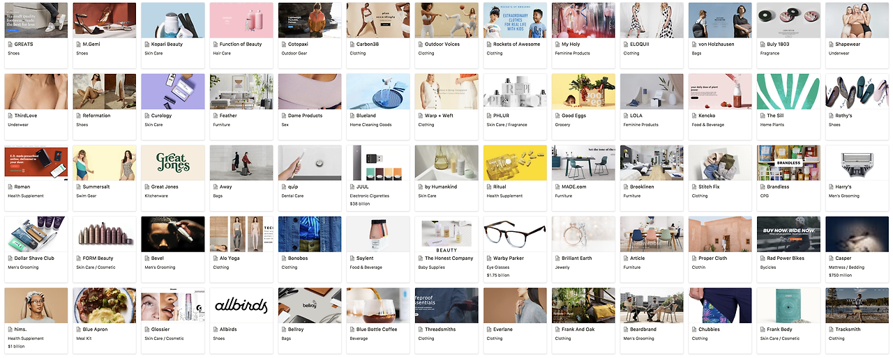 Warby Parker, Allbirds, Casper, Brandless, Everlane, Milk Makeup, Bark Box, Chubbies, Glossier, Dame Products, Harry’s, Blue Apron, Away, The Sill, Quip, Ritual, Beardbrand, Care/Of, Brooklinen, Great Jones, LOLA, Kencko, JUUL, Soylent, …