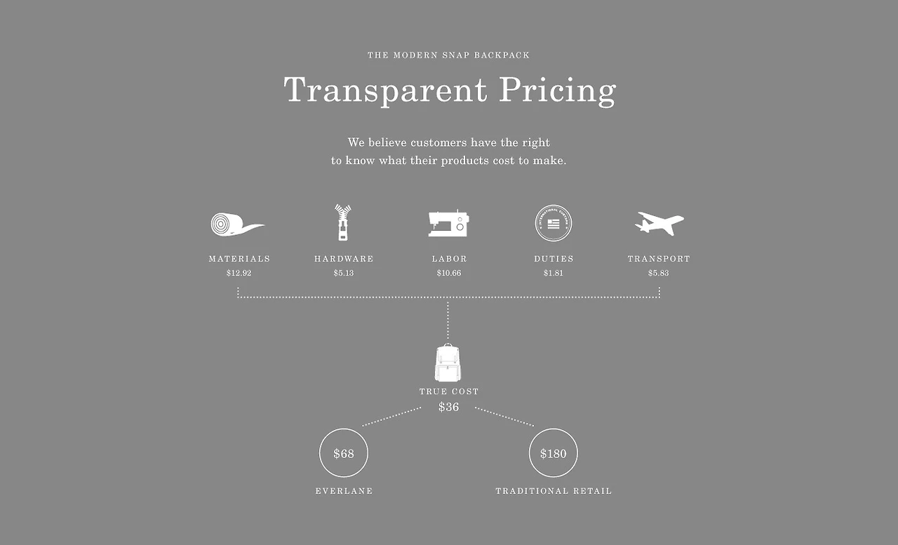 소비자에게 합당한 가격을 제공하는 것은 모든 브랜드가 내세우는 전략이다. 그러나 오래도록 경쟁이 정체된 시장에서의 가격 차별화는 그 자체로 소비자에게 신선함이 되기도 하는데, 안경 시장에서의 Warby Parker, 면도기 시장에서의 Dollar Shave Club, 여행 가방 시장에서의 Away 등의 사례가 그렇다. 제품보다 가격 차별성에 더 중점을 두는 경우도 종종 있다. Brandless는 모든 생활 잡화 제품의 가격을 $3로 통일하는 단순하고 강력한 가격 정책으로 시작되었다. Everlane은 제조 및 유통 공정에 필요한 비용과 마진을 모든 제품에 표기해두어 가격 투명성을 적극적으로 어필한다.