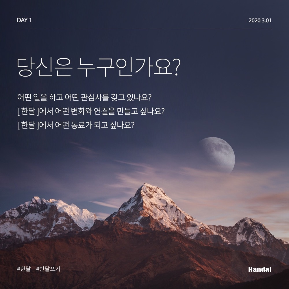 <반달 쓰기> 1일 차 공식 질문은 "당신은 누구인가요?"이다. 보통 이런 질문을 받으면 내 이름, 나이, 하는 일 정도를 말하는 것 같다. 여기에 추가적으로 관심사나 취미 정도를 더하는 정도?