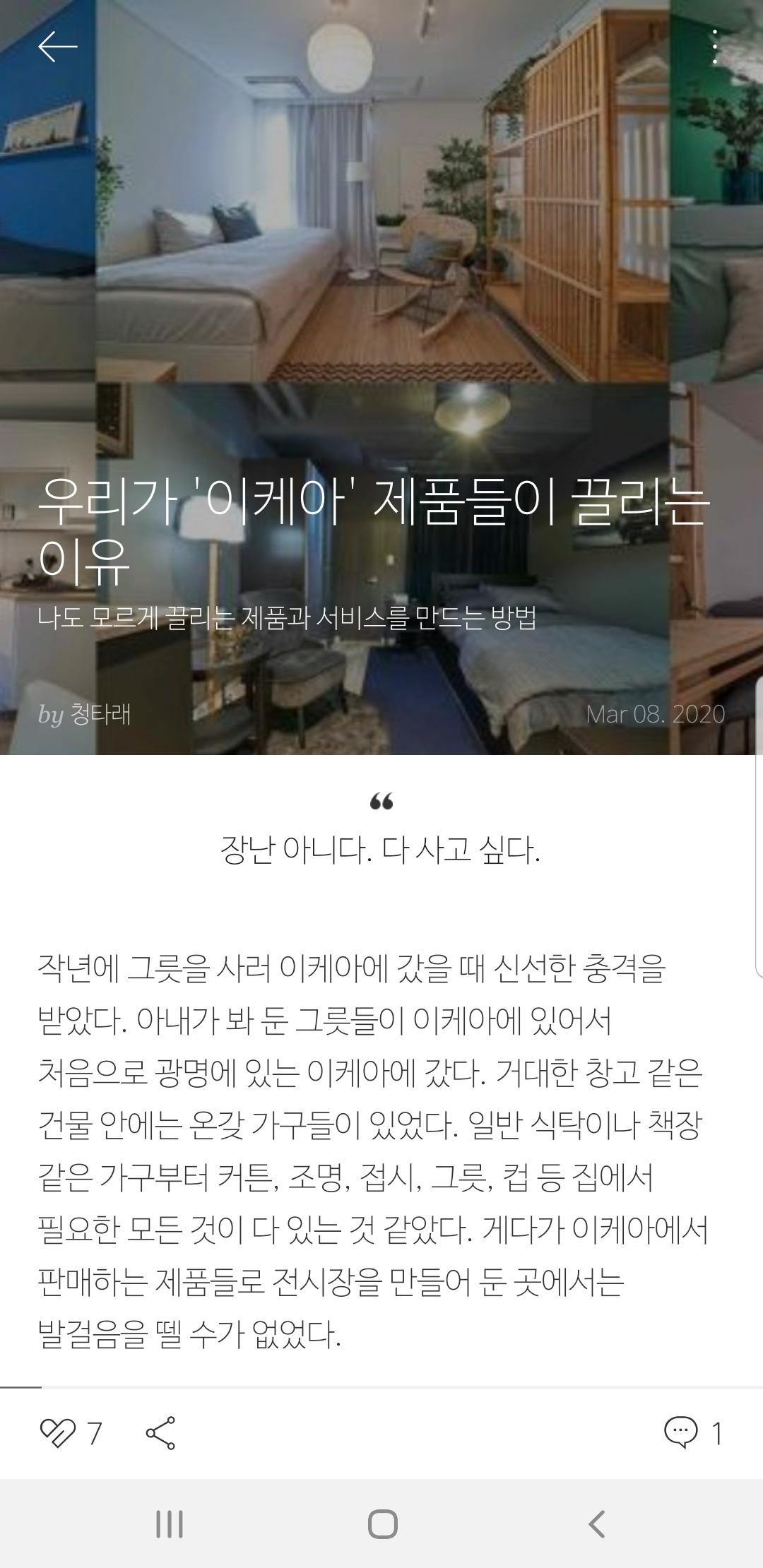 우리가 '이케아' 제품들이 끌리는 이유 나도 모르게 끌리는 제품과 서비스를 만드는 방법 | 장난 아니다. 다 사고 싶다. 작년에 그릇을 사러 이케아에 갔을 때 신선한 충격을 받았다. 아내가 봐 둔 그릇들이 이케아에 있어서 처음으로 광명에 있는 이케아에 갔다. 거대한 창고 같은 건물 안에는 온갖 가구들이 있었다. 일반 식탁이나 책장 같은 가구부터 커튼, 조명, 접시, 그릇, 컵 등 집에서 필요한 모든 것이 다 있는 것 같았다. 게다가 이케아에서