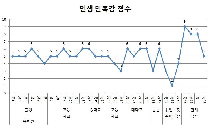 인생 만족감 점수 중 26살이 1점이다. 최악이라는 뜻인데 정확히는 첫 직장에 있는 1년이다. 2016년 하반기부터 2017년 상반기까지 있었는데 차라리 군대에 돌아가고 싶었다. 인수인계 없이 사수의 샘플을 내내 만들다가 갑자기 고객사 대응에 나가고 스스로 배우는게 가장 좋다는 핑계로 자신이 아는 것도 다른 부서로 보내서 물어보게 했다. 담배 냄새를 극혐하는 나를 억지로 흡연장에 끌고가서 자기 말 듣게 하고... 아침에 일어나기가 싫은 하루하루였다. 그래서 처음으로 몸이 아프다는 거짓말을 하고 하루 쉬기도 했다.