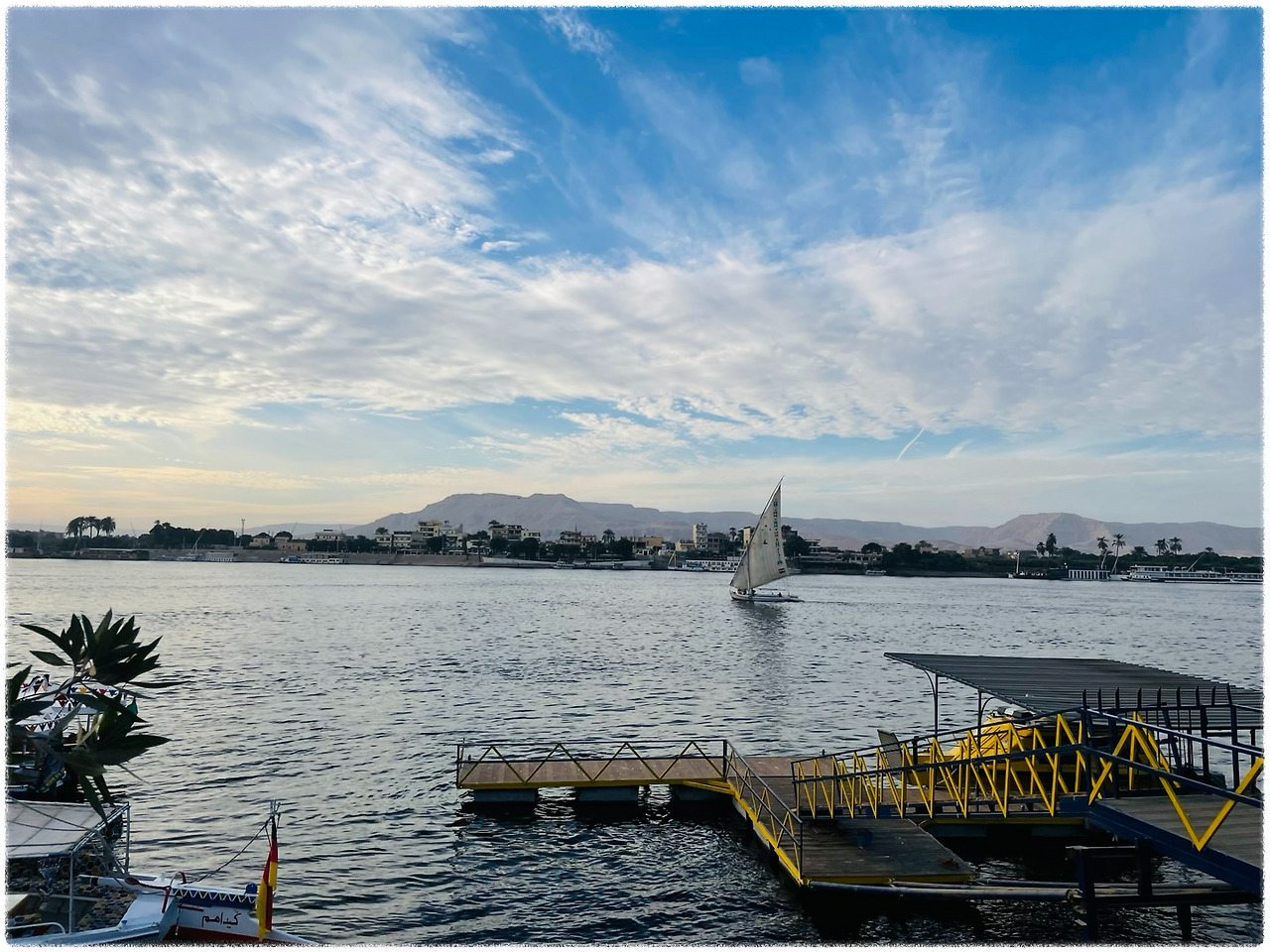 강가에 서서 부드럽게 일렁이는 나일강을 바라본다. 잔잔한 물결 위로 크루즈선들이 길게 늘어서 있고, 그 사이로 전통적인 펠루카(Felucca) 한 척이 고요히 떠다닌다. 룩소르의 아침 하늘은 맑고 푸르며, 공기는 한층 더 상쾌하다. 나일강 건너편에는 룩소르 서쪽 유적지가 아련히 보인다. 햇살을 머금은 사원과 모래빛 건축물들이 이집트 고대의 숨결을 전하는 듯하다.