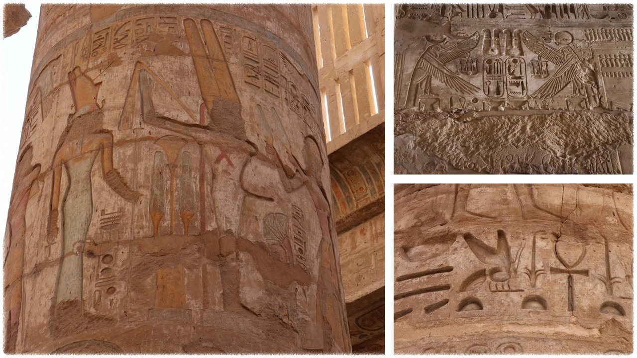 고대 이집트인들이 사용한 문자로, 일반적인 글자가 아닌 상형문자였다. 그림처럼 보이지만, 사실상 완전한 글자 체계였다. 새, 뱀, 벌, 눈, 태양, 사람 형상 등이 조합되어, 왕의 업적을 기록하고 신들에게 기도를 바치는 문장이 되었다. 나는 천천히 손가락으로 그 문양을 따라 그려보았다. 이 문자가 새겨질 당시, 이곳은 신과 왕만이 드나드는 성스러운 공간이었을 것이다. 이곳을 지나던 파라오들은 기둥에 새겨진 신들의 이름을 읽고, 자신이 신과 연결된 존재임을 확인했을 것이다.