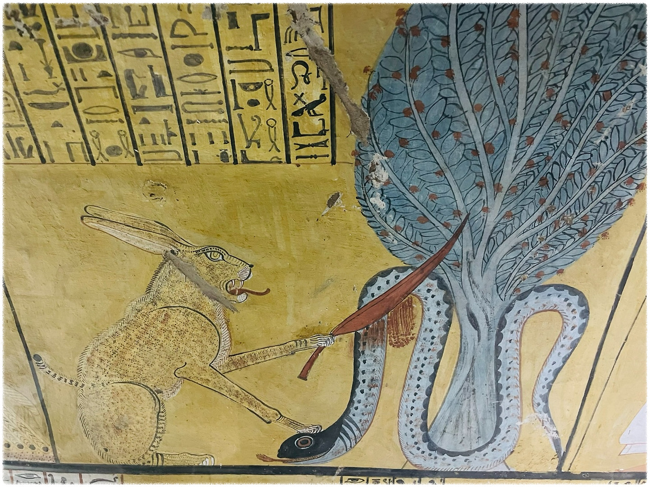 그러나 죽음이 늘 평온한 것만은 아니었다. 이곳의 벽에는 어둠과 혼돈을 상징하는 존재도 함께 남겨져 있었다. 칼을 든 고양이가 거대한 뱀과 대치하고 있었다. 뱀의 몸은 뒤틀려 있었고, 그 위로 우뚝 솟은 나무가 함께 그려져 있었다. 그것은 바로 태양신 라를 위협하는 혼돈의 존재, "아포피스(Apophis)"였다. 밤마다 태양신의 배를 삼키려 하지만, 결국 패배하고 다시 아침이 밝아온다.