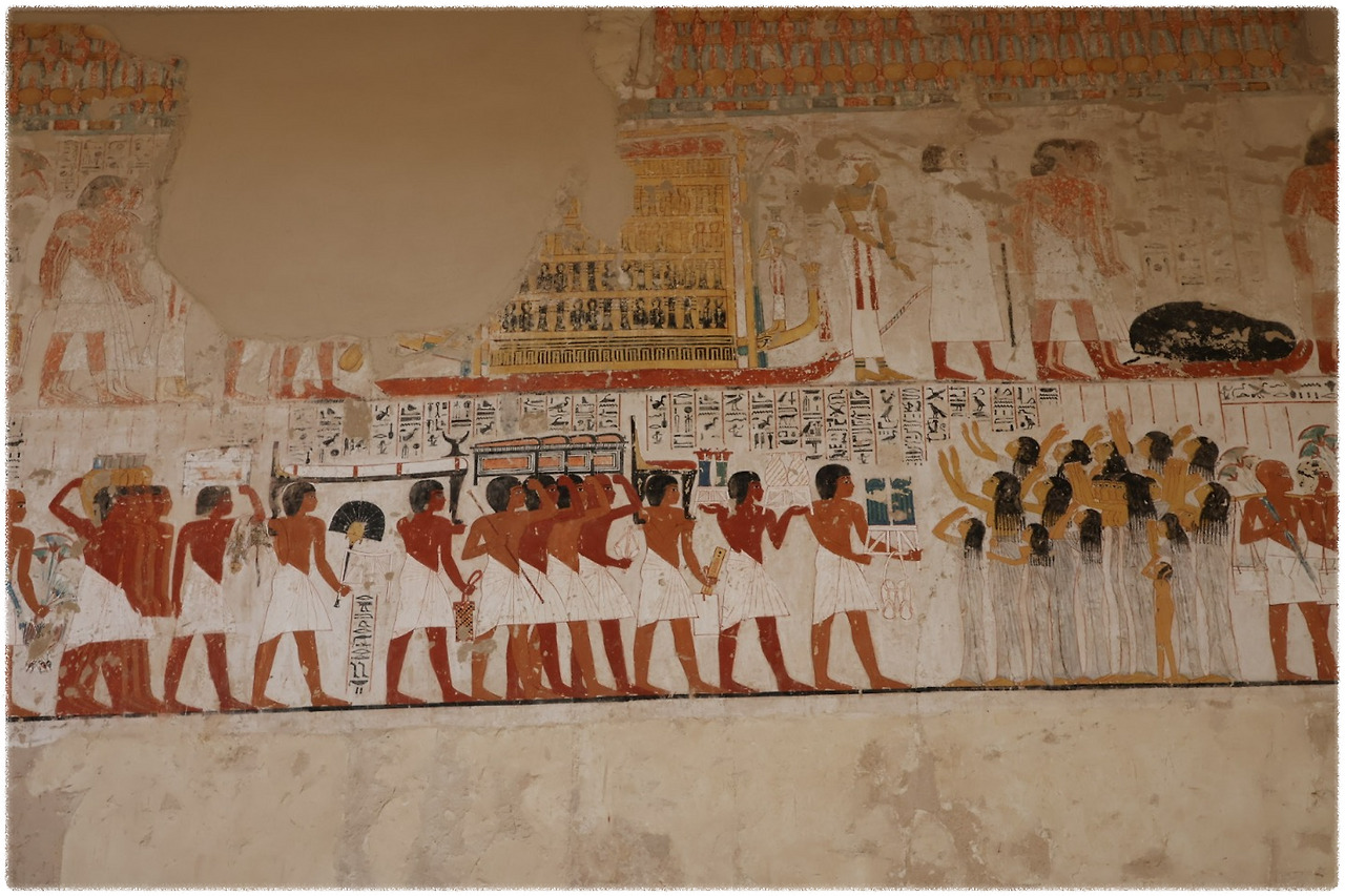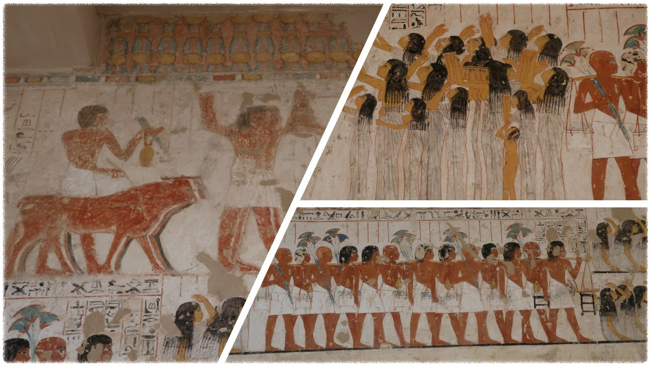 무덤의 내부는 크고 웅장했지만, 완벽하게 남아 있는 장면은 많지 않았다. 그러나 한쪽 벽에는 여전히 선명한 흔적들이 남아 있었다. 그중에서도 가장 인상적인 것은 장례 행렬과 울고 있는 여인들의 벽화였다. 흰색 얇은 옷을 걸친 여성들이 얼굴을 감싸 쥐고 통곡하고 있었다. 이 장면은 단순한 애도가 아니었다. 고대 이집트에서 슬픔을 표현하는 방식이었고, 고위 관료의 죽음을 기리는 엄숙한 의식의 일부였다. 그 옆으로는 라모세를 기리며 공물을 바치는 신하들과 그의 위엄을 보여주는 장면들이 이어지고 있었다.