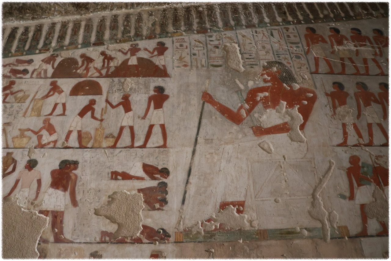 라크미레의 무덤은 보다 체계적이고 정교하게 남아 있었다. 관리들은 줄을 서서 보고를 하고, 서기관들은 빠짐없이 숫자를 기록하고 있었다. 그러나 조금만 시선을 돌리면, 그들의 행정이 유지될 수 있었던 이유가 드러났다. 창고를 가득 채운 곡식, 무거운 바구니를 이고 가는 사람들, 빵을 굽는 여성들, 그리고 구석진 곳에서 채찍을 맞으며 돌을 나르는 남자들. 그들은 아무 말 없이 묵묵히 움직이지만, 벽화 속에 남은 그들의 표정은 무덤 주인의 것보다 더 생생하게 다가왔다.