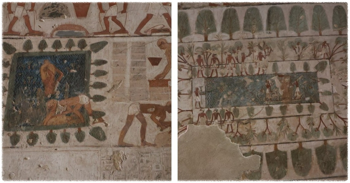그렇게 무덤 속을 거닐던 내 눈에, 벽 한쪽에 자리 잡은 또 다른 장면이 들어왔다. 푸른 나뭇잎과 나무들로 둘러싸인 과수원. 그 안에서 한 사람이 물을 긷고 있고, 또 다른 사람은 땅을 다듬으며 과일을 수확하고 있었다. 고된 노동의 장면들 사이에서 이 벽화는 유난히 평온해 보였다. 이것은 라크미레가 생전에 바라던 것일까? 아니면, 사후 세계에서 그가 누리기를 원했던 이상적인 삶이었을까?