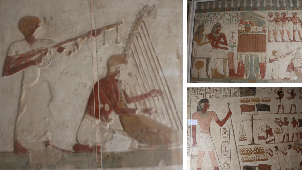 무덤 벽화에는 그의 삶이 얼마나 질서 정연하고도 성대한 지 잘 드러나 있다. 가장 먼저 눈에 들어오는 건, 줄지어 들어오는 행렬과 커다란 제물 더미다. 거대한 빵과 과일 바구니, 살진 소와 거위, 술 항아리들이 질서 있게 나열된 모습은 마치 왕실 축제의 한 장면처럼 보인다. 그러나 이는 단지 연회의 한순간이 아니다. 그가 얼마나 풍성한 재화를 다뤘는지를 보여주는, 말 그대로 ‘정치의 풍경’이었다.