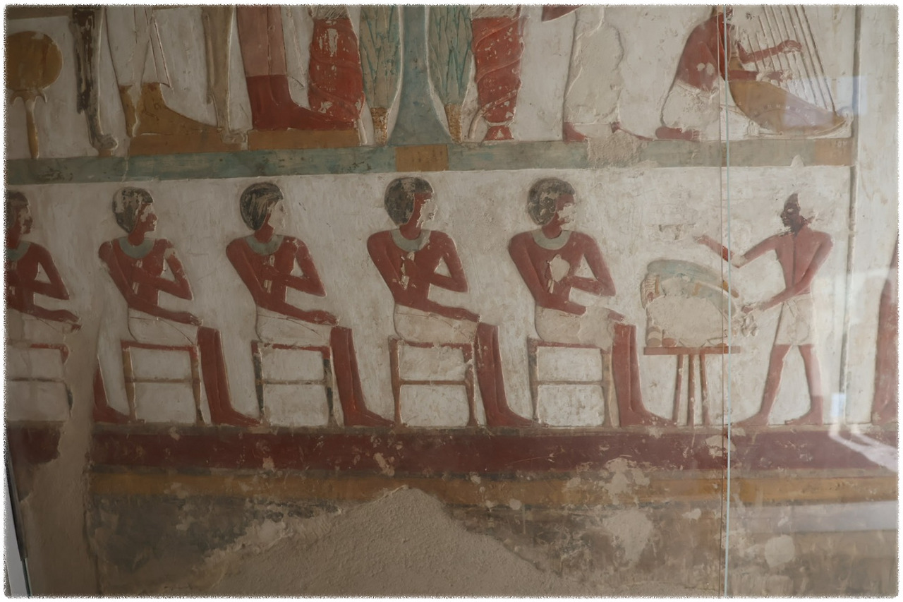 그런 그를 위해 음악은 빠질 수 없었다. 벽화에서는 하프와 리라를 연주하는 음악가들의 행렬이 등장한다. 가슴에 손을 얹은 채 연주하는 그들의 자세는 그저 악기를 다루는 자의 모습이 아니었다. 그것은 마치 신성한 의식에 동참하는 제사장의 품위였고, 눈빛에는 한 치의 흐트러짐 없는 집중과 경외가 담겨 있었다.