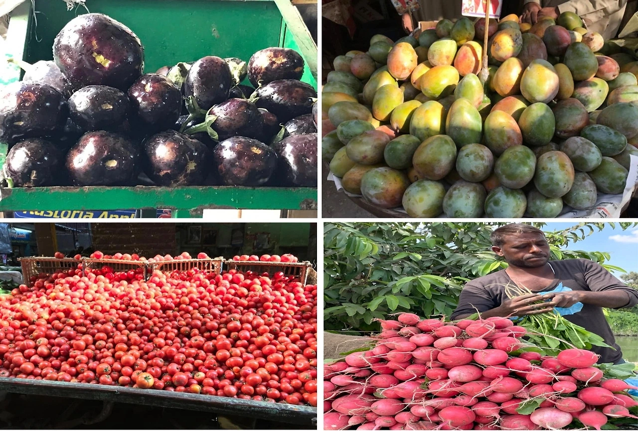 시장에서는 가지가 윤기 있게 쌓여 있고, 햇빛을 머금은 망고가 탐스럽게 담겨 있다. 붉은 토마토는 한 트럭 가득 쏟아져 있고, 갓 뽑은 무를 다듬는 농부의 손끝에는 강물이 맺혀 있다.